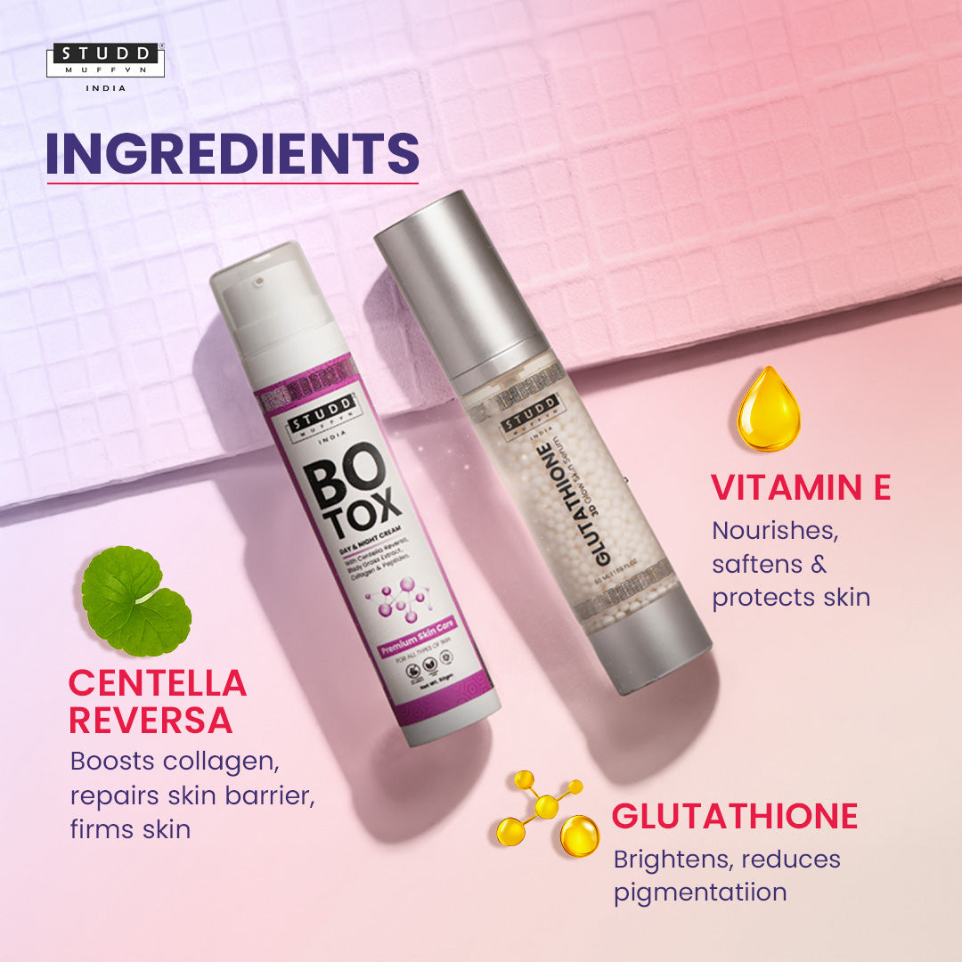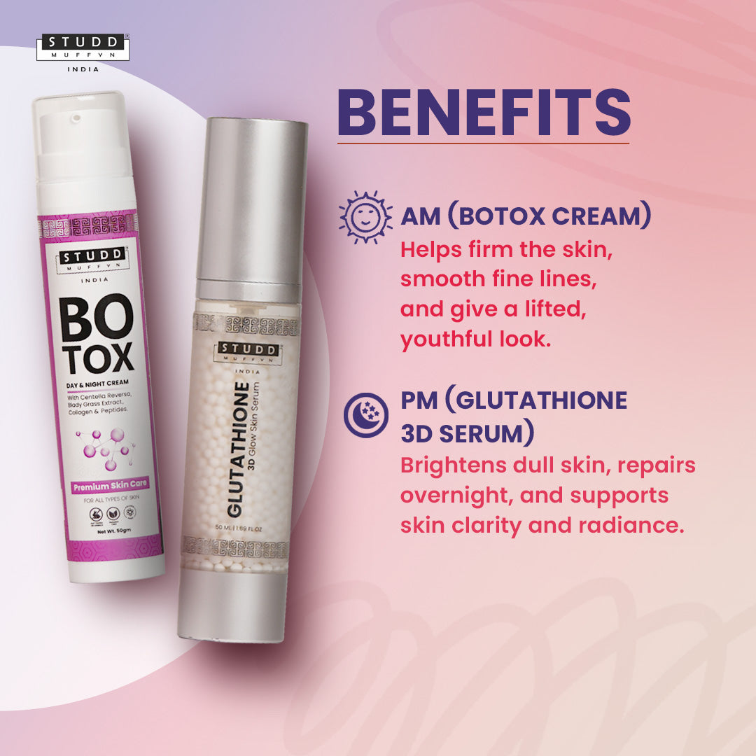 PM (Glutathione 3D Serum): Brightens dull skin, repairs overnight, and supports skin clarity and radiance.