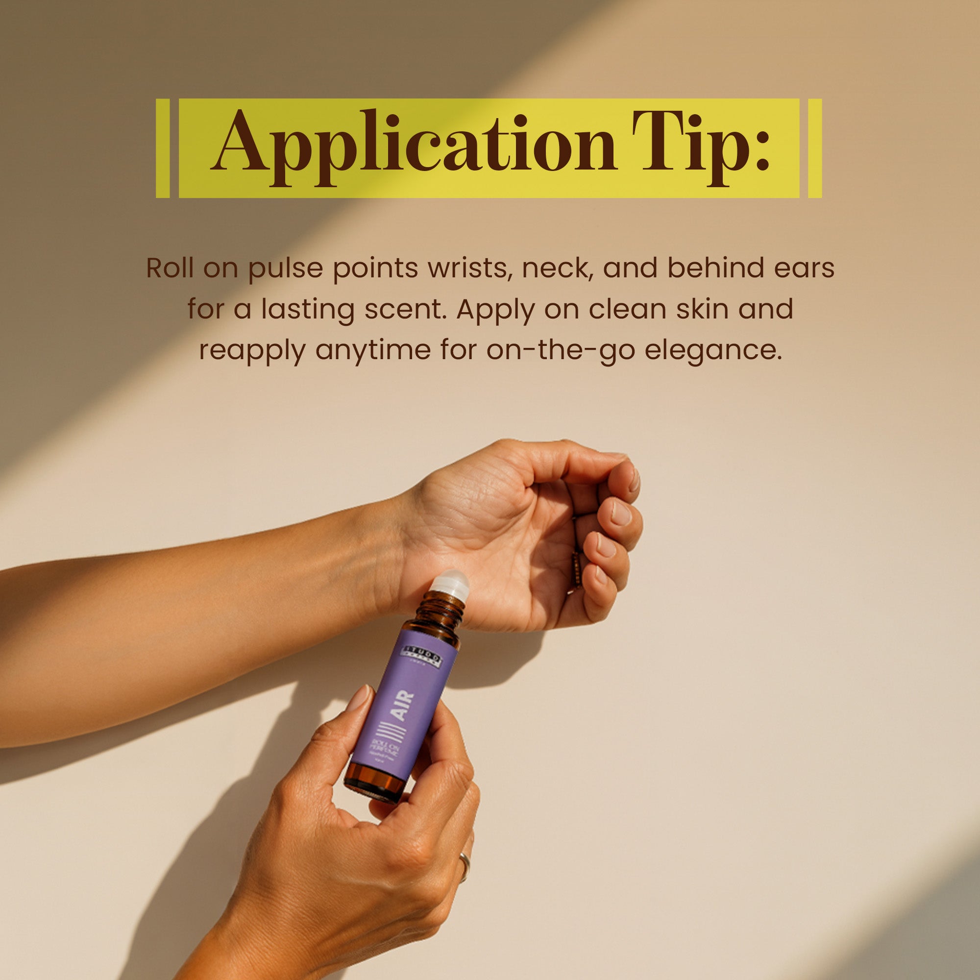 Gently roll the perfume on pulse points – wrists, neck, and behind ears.