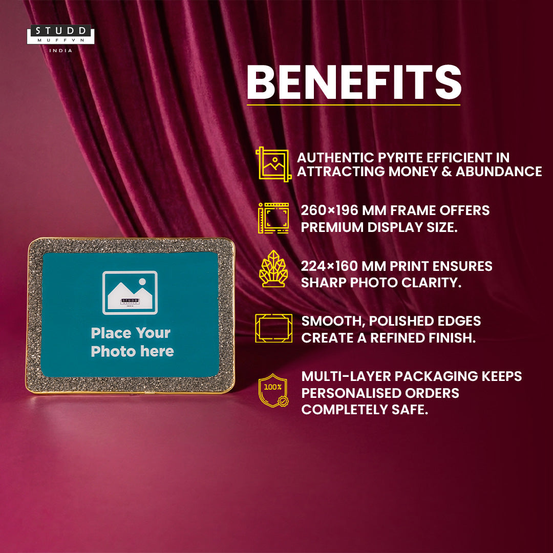 Each frame is embedded with authentic, certified Pyrite, known for its powerful manifestation and abundance-attracting properties. Paired with premium craftsmanship, this frame becomes more than décor — it becomes an energy-enhancing statement for your home or workspace.