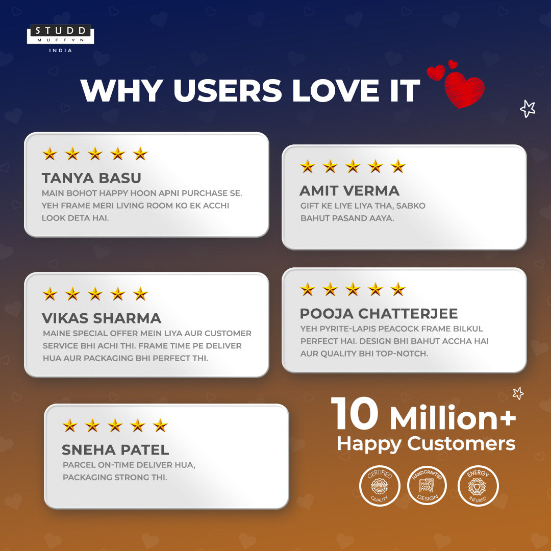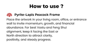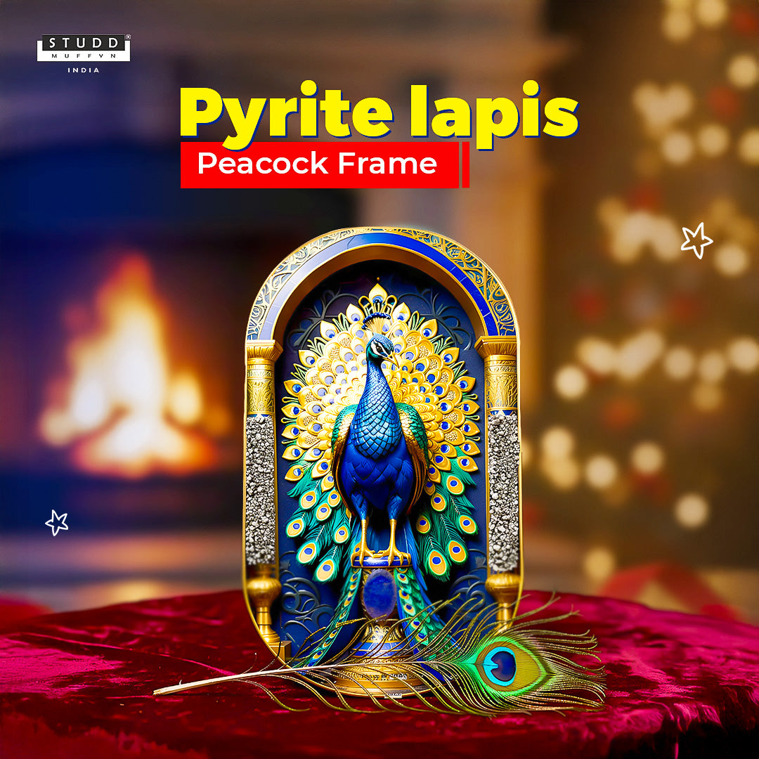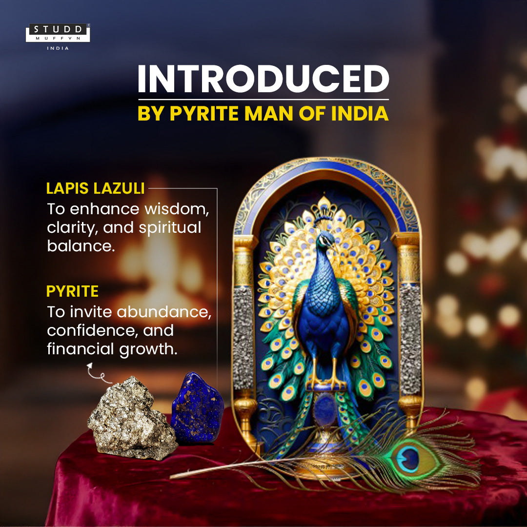 Celebrate grace, abundance, and wisdom with the Pyrite–Lapis Peacock Frame by Studd Muffyn. Proudly made in India by the nation’s largest crystal home décor manufacturers, where craftsmanship meets timeless energy. The majestic peacock, a timeless symbol of beauty and prosperity, is artistically crafted with a blend of golden Pyrite and deep-blue Lapis Lazuli crystals.