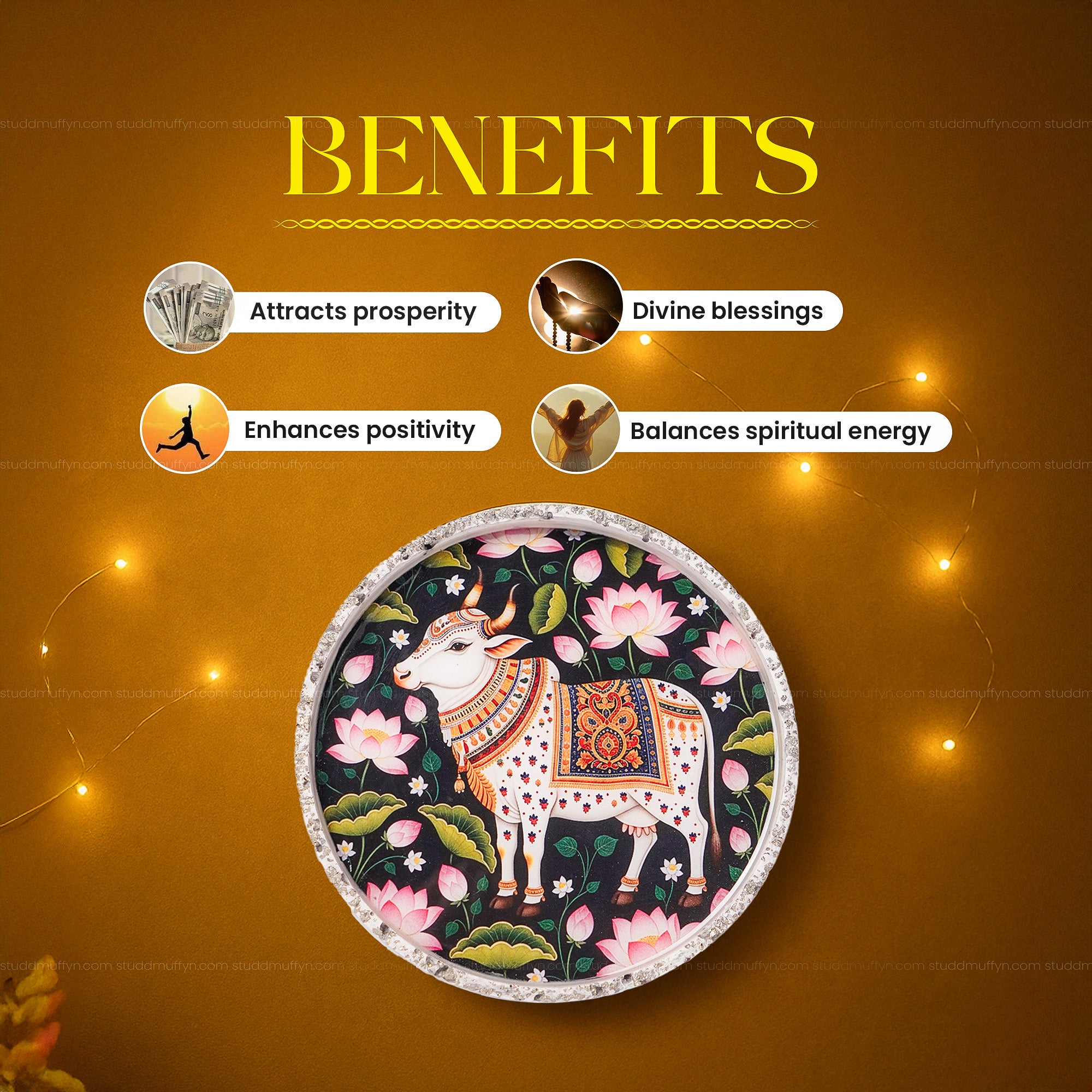 - Detailed Gau Mata artwork set against a lotus backdrop.