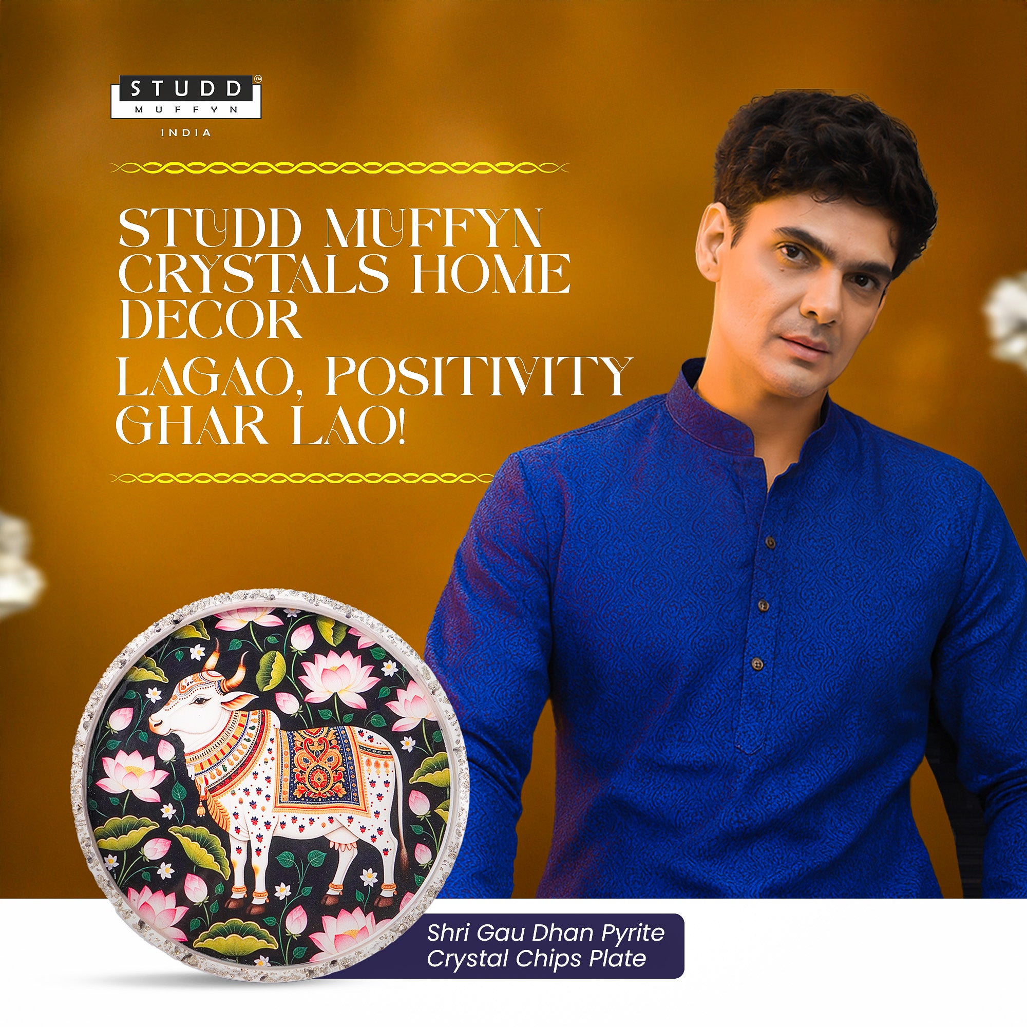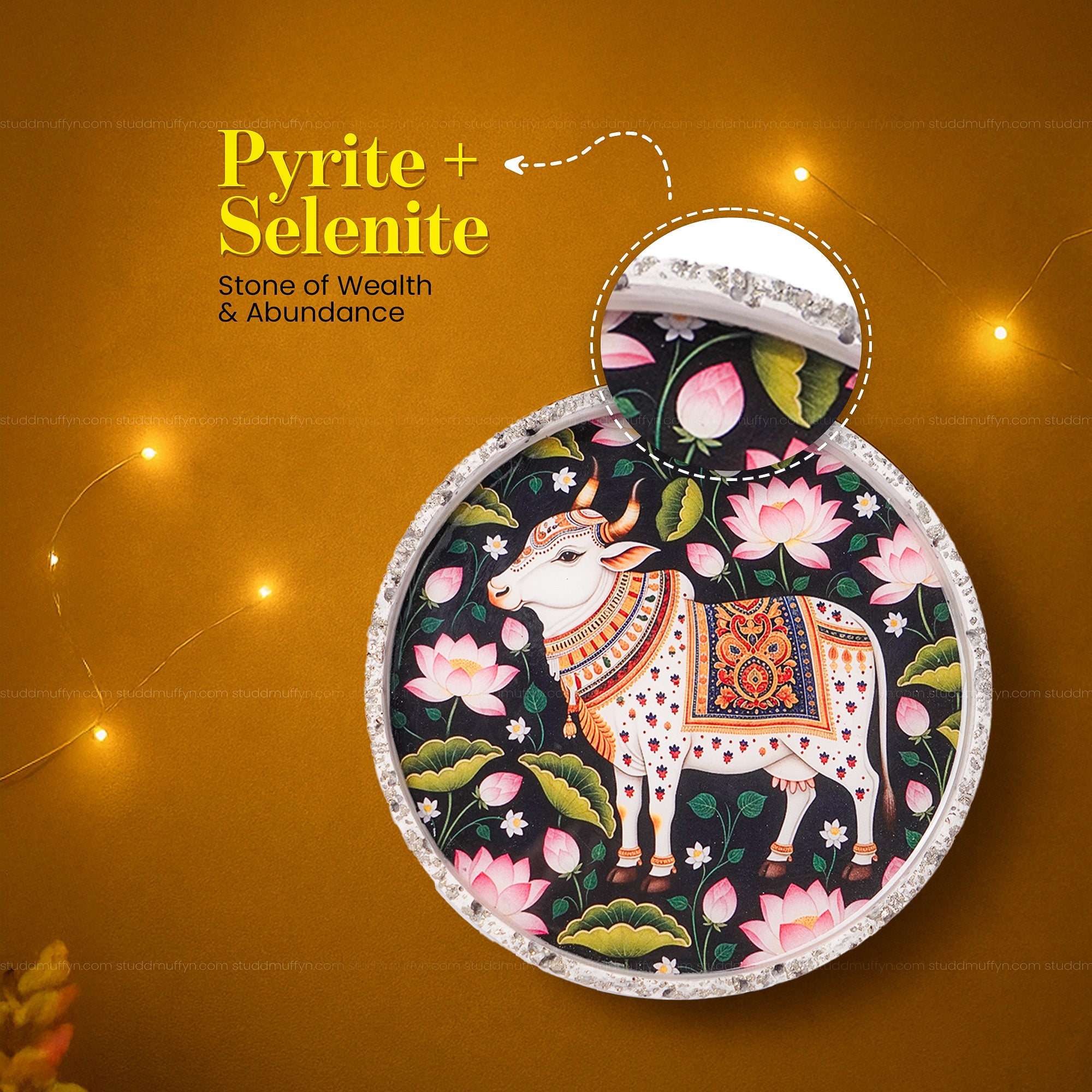 The Shri Gau Dhan Pyrite Crystal Chips Plate is a sacred emblem of abundance and spiritual harmony. Featuring the revered Gau Mata, surrounded by vibrant lotus blooms, this handcrafted plate embodies divine grace and auspicious energy.