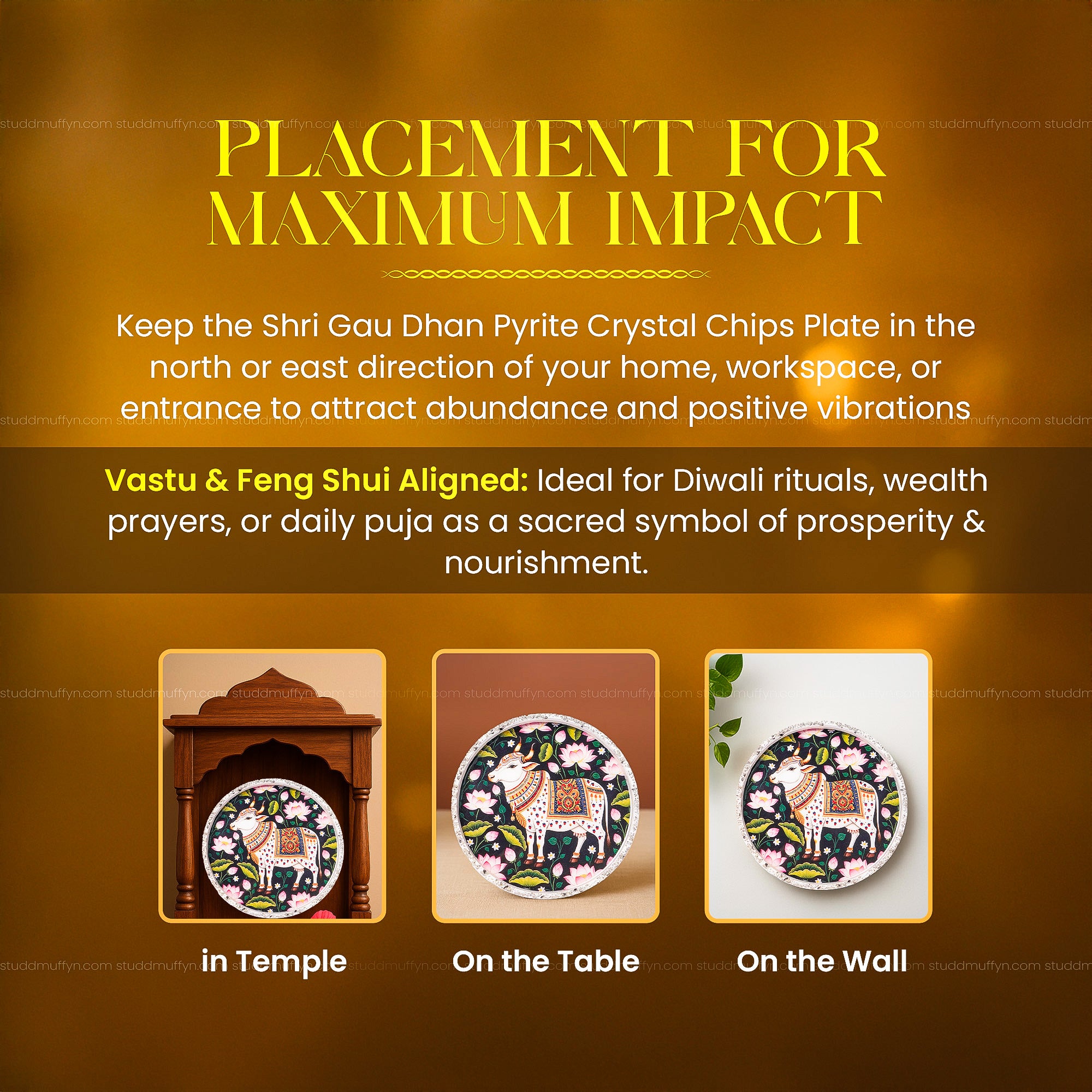 Placement: Keep the Shri Gau Dhan Pyrite Crystal Chips Plate in the north or east direction of your home, workspace, or entrance to attract abundance and positive vibrations.