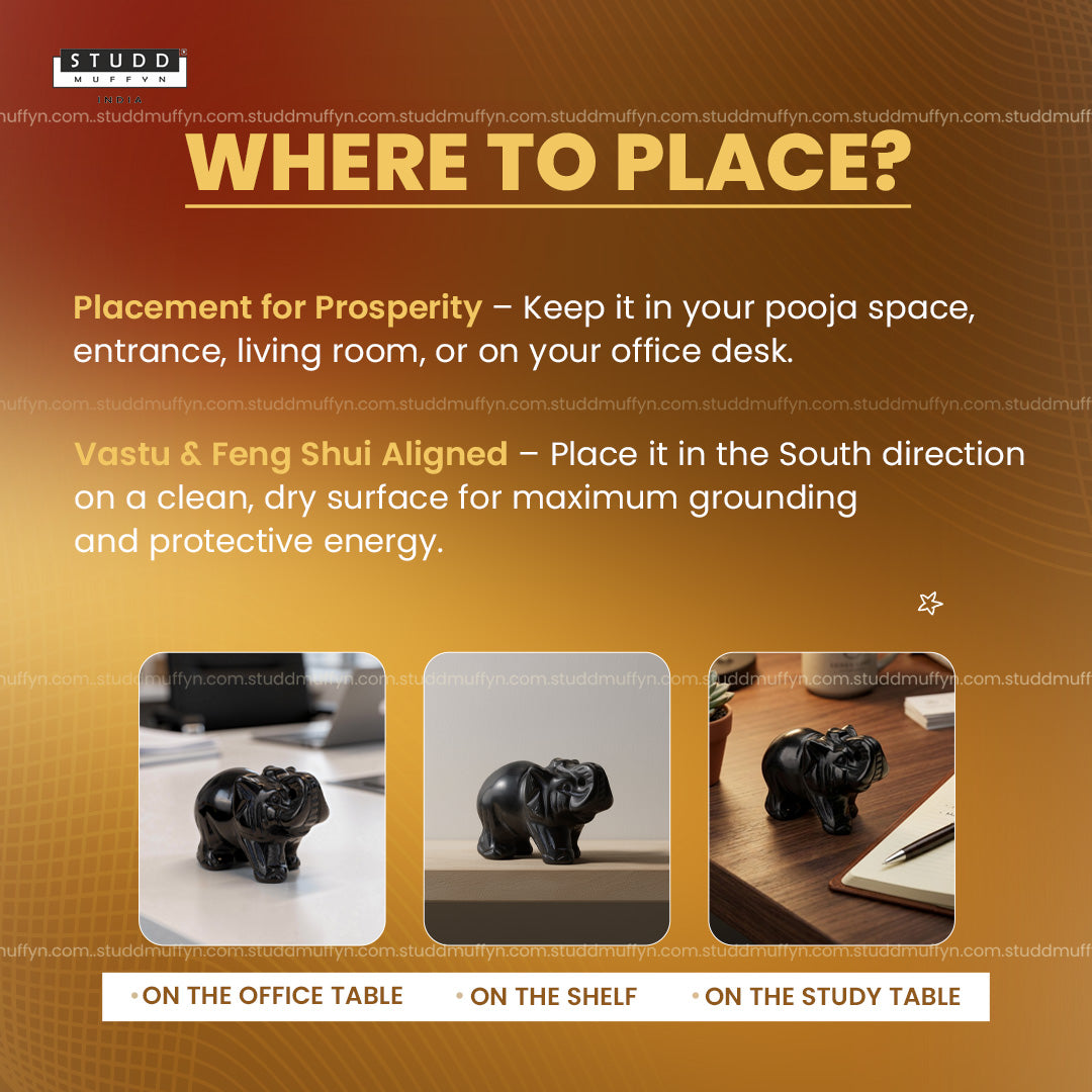 • Vastu & Feng Shui Placement: As per Vastu and Feng Shui principles, placing the Black Obsidian Elephant in the North-East or South-West corner of your home, office, or workspace is believed to promote protection, clarity, and positive energy flow.