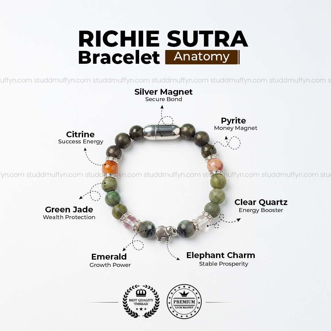 Studd Muffyn presents the Richie Sutra Bracelet, designed with a symbolic elephant charm at the center and surrounded by a powerful combination of Emerald, Clear Quartz, Green Jade, Citrine, and Pyrite to support abundance, stability, and success.