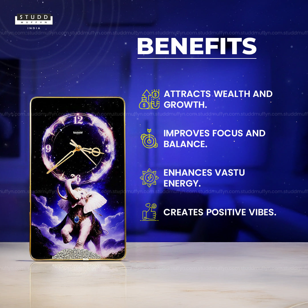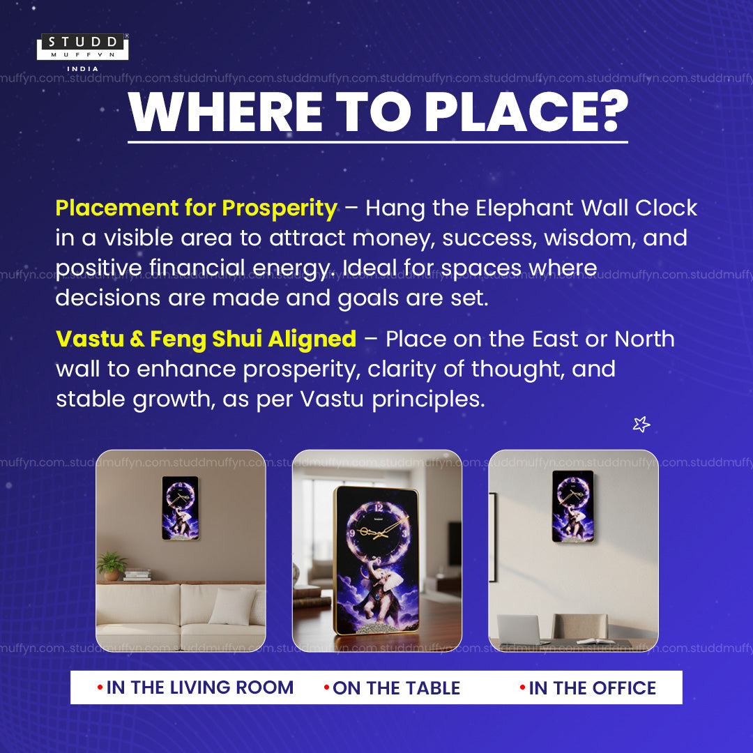 Hang the Elephant Wall Clock in a visible area to attract money, success, wisdom, and positive financial energy. Ideal for spaces where decisions are made and goals are set.