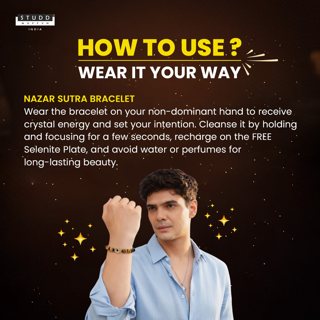 From the house of Studd Muffyn Crystal Collection, the Nazar Sutra Bracelet is consciously crafted to guard you against nazar, negative attention, and unwanted energies—while helping you stay grounded, confident, and mentally clear throughout the day.
