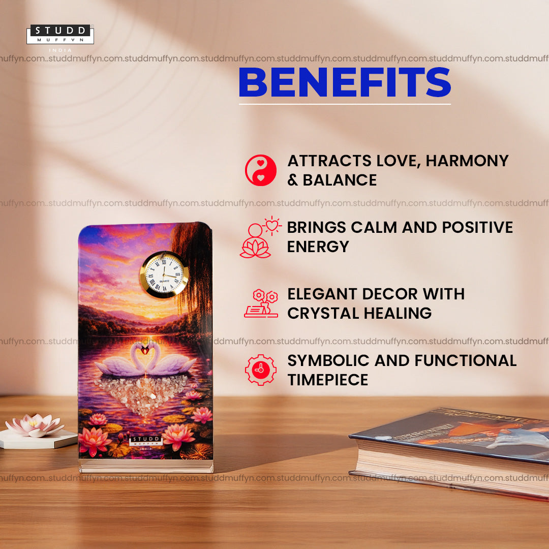 Bring romance, calm, and emotional balance into your space with the Pair of Swans Rose Quartz Crystal Table Clock by Studd Muffyn — a graceful fusion of crystal energy, artful design, and functional décor.