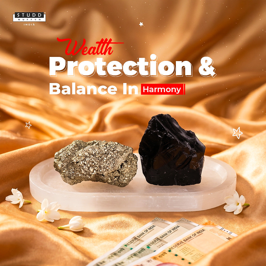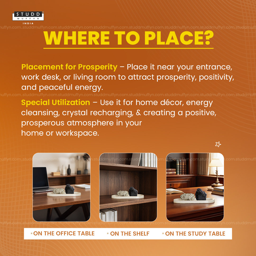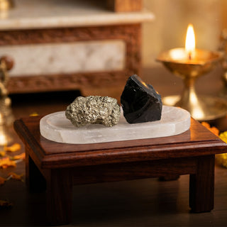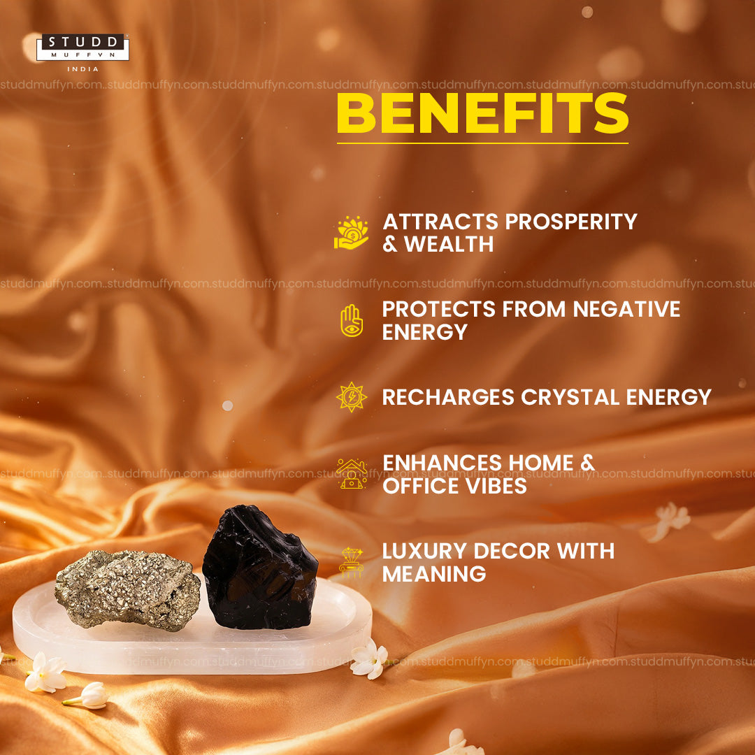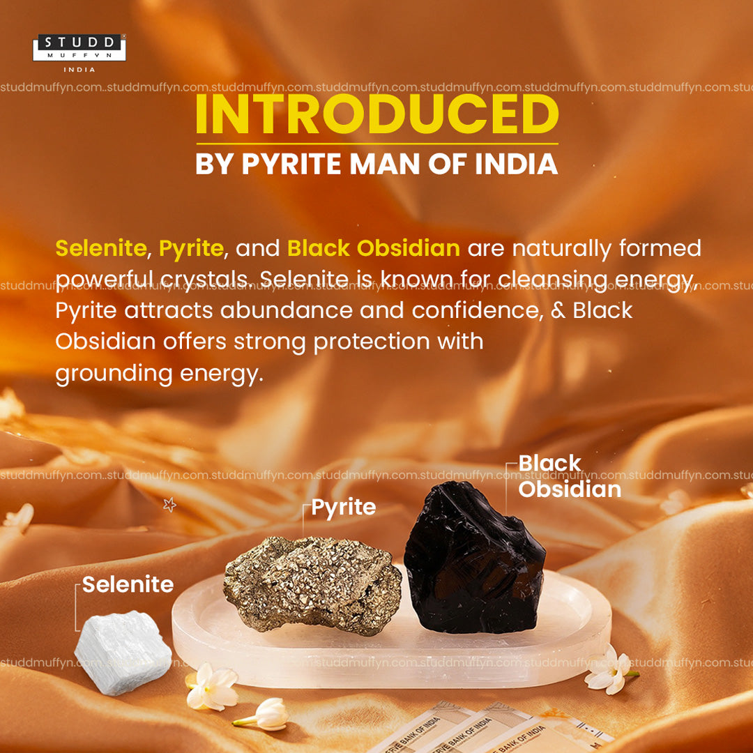 This set brings together three powerful elements—Pyrite, Black Obsidian, and a Selenite plate—each with its own purpose, working quietly in the background. Pyrite is often linked with confidence and growth, helping you stay focused on opportunities and progress. Black Obsidian is known for protection, helping reduce the impact of negative energy and outside distractions. And the Selenite plate acts as a natural base that helps maintain a clean and balanced environment.