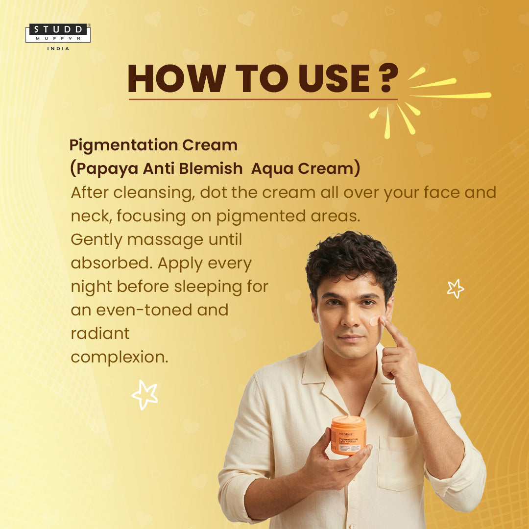 After cleansing, dot the cream all over your face and neck, focusing on pigmented areas. Gently massage until absorbed. Apply every night before sleeping for an even-toned and radiant complexion.