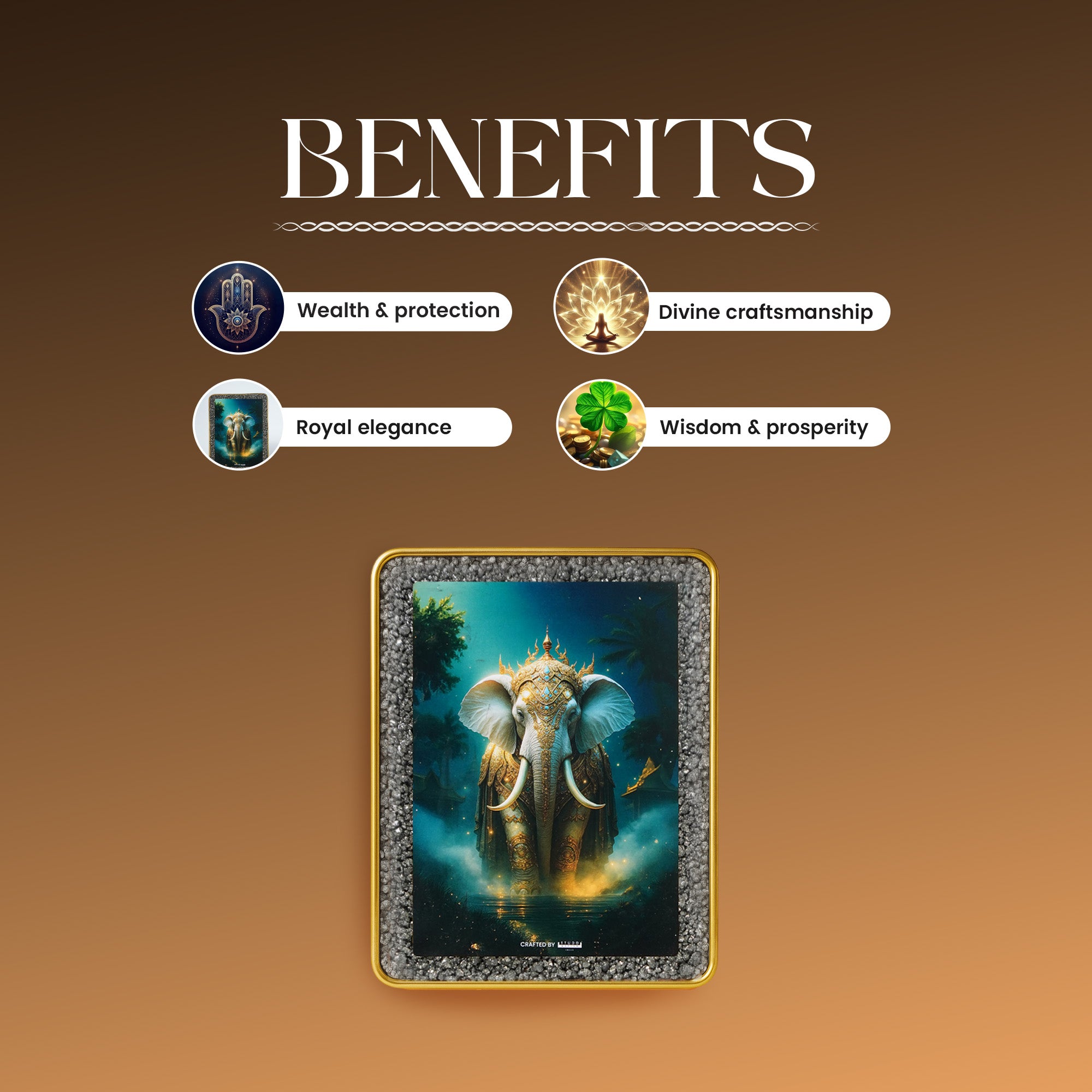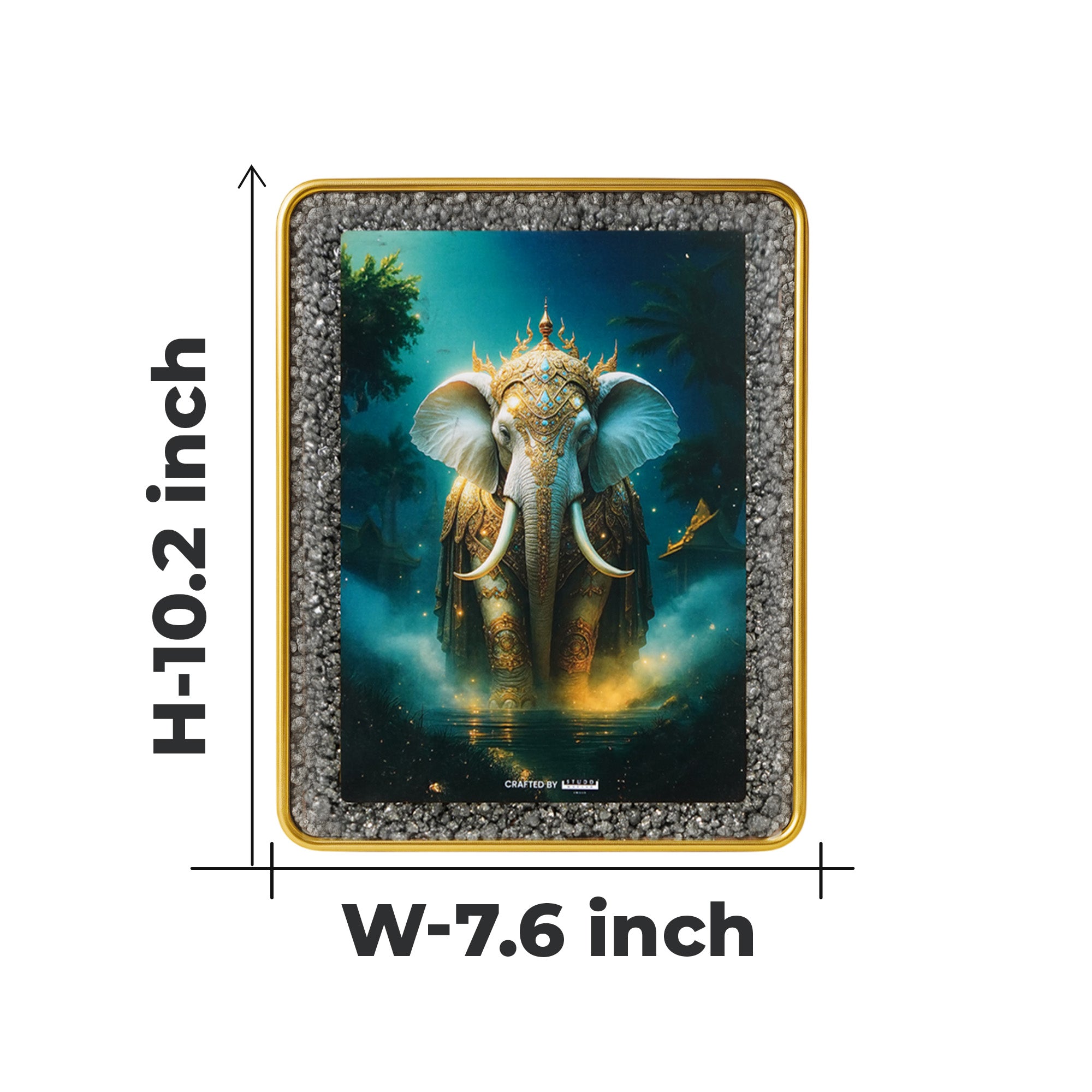 This extraordinary piece captures that sacred symbolism in stunning detail — a royal elephant, adorned with intricate golden armor, rising with grace and dignity from a mystical backdrop.