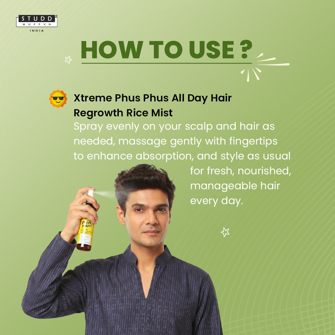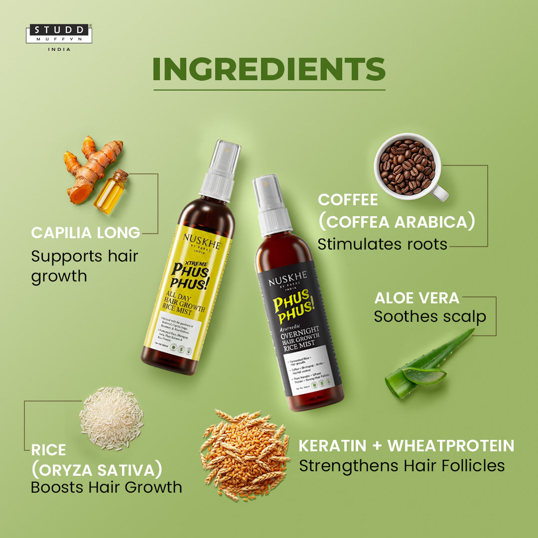 Xtreme Phus Phus All Day Hair Regrowth Rice Mist [AM] - Rice (Oryza sativa) Ext., Aloevera (Aloe barbadensis) leaf Ext., Fenugreek (Trigonella foenum-graecum) Ext., Bhringraj(Eclipta alba) Ext., Neem(Azardirachta indica) Ext., Rosemary ( Rosmarinus officinalis) Ext., Coffee (Coffea Arabica) Ext., Pumpkin (Cucurbita pepo) Ext., Larix Europaea Wood Extract, Camellia Sinensis Leaf Extract, Capilia longa(Curcuma longa) Ext. Rice (Oryza sativa) Protein, Plant Keratin Protein