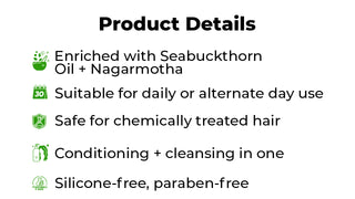 The blend of Seabuckthorn Oil, Nagarmotha & Rice Protein penetrates deeply into each strand, replenishing lost nutrients and making hair feel softer, smoother, and healthier with every wash.