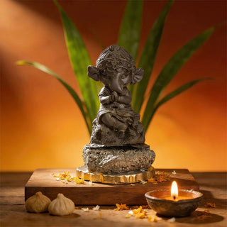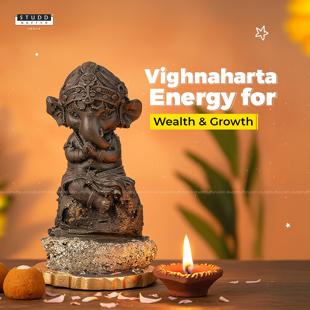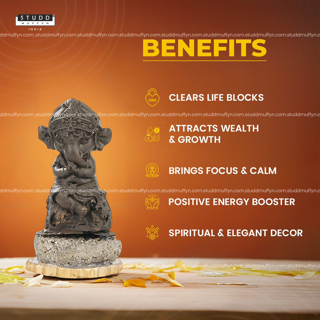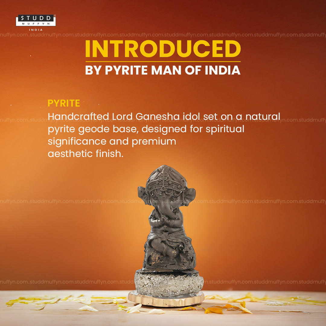 The Ganesha idol itself is crafted from Pyrite, a crystal widely associated with wealth, abundance, and opportunities. The natural Pyrite Geode base further amplifies this energy, symbolizing stability, confidence, and continuous growth.