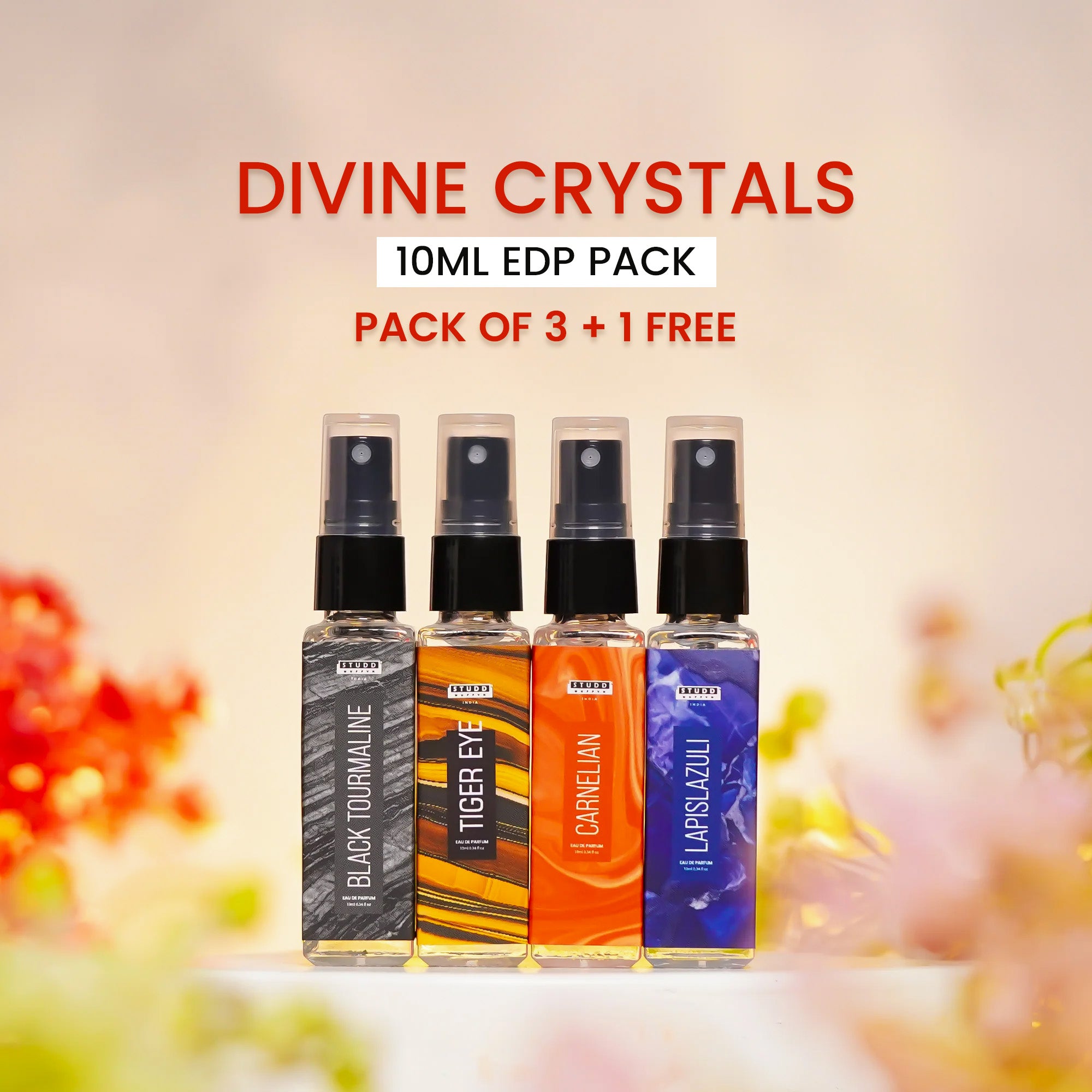 Elevate your energy with the Divine Crystals 10ml EDP Pack, a mystical blend of fragrances infused with the essence of four powerful crystals—Tiger Eye, Lapis Lazuli, Black Tourmaline, and Carnelian. Designed for those who seek balance, protection, and empowerment, each scent resonates with the unique energy of its crystal, bringing harmony to your aura.