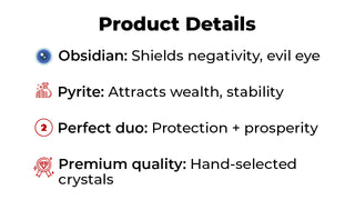 Black Obsidian is a powerful crystal that acts as a guardian, shielding you from negativity and cleansing your energetic space whereas Pyrite, often called the "money magnet" is your key to attracting wealth and prosperity. It's not just about financial success; Pyrite also invites fame and overall success into your life.