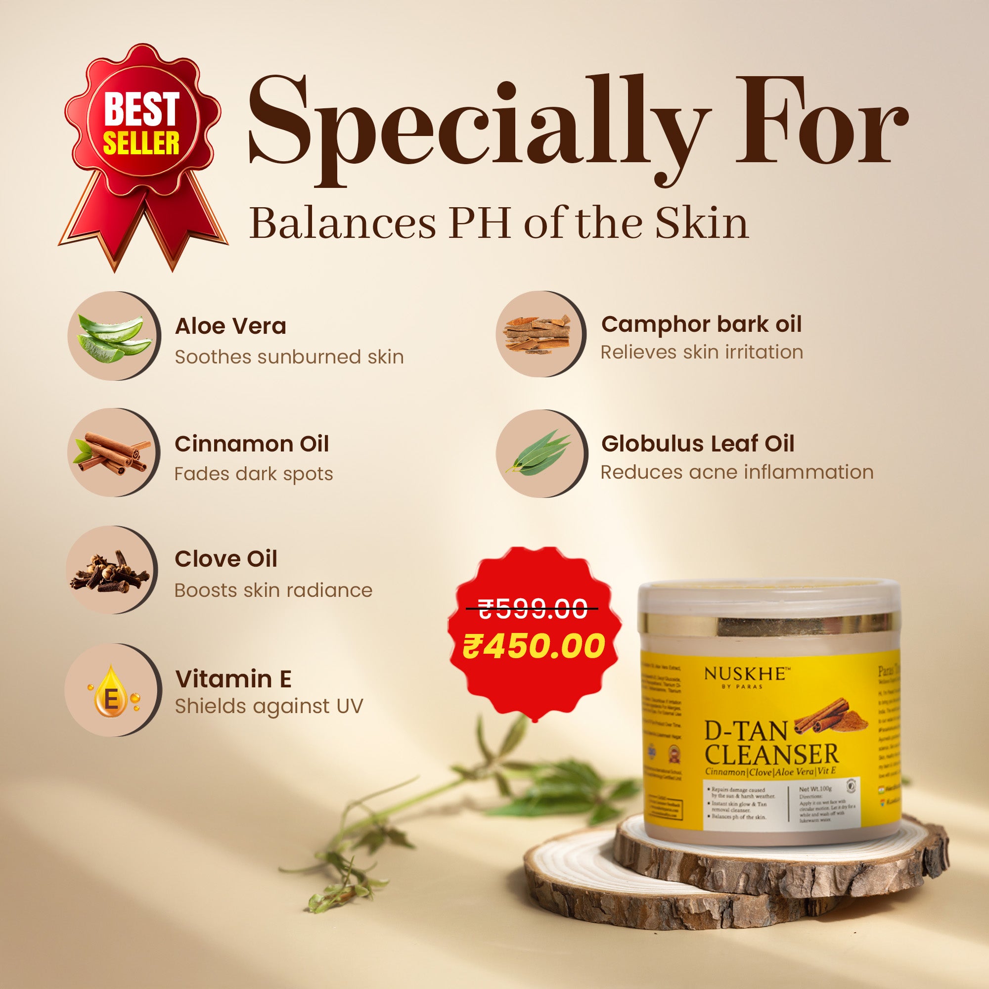 The Nuskhe by Paras D-Tan cleanser is specially designed to control eruptions on your skin to give you that acne-free look. A deep-pore cleanser, it helps remove impurities and excess oil from within the pores. 2 percent dissolves excess oil and surface build-up to prevent acne formation. NOTE:- People with sensitive skin are advised to perform a patch test. If a rash, redness, or itching appears, stop using it. Net Vol. 100gm |