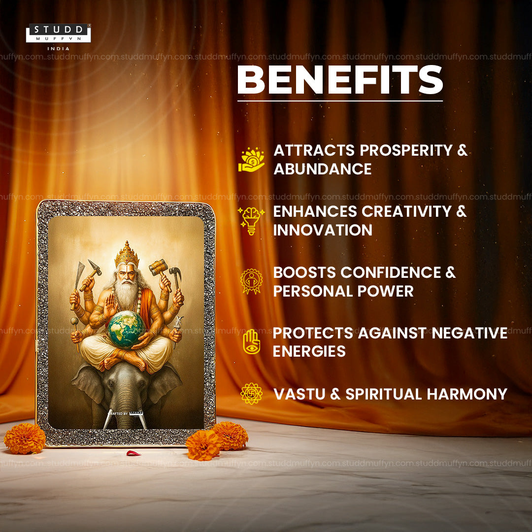 Celebrate the divine architect of the universe with this Lord Vishwakarma Pyrite Plate. Known as the God of creation, craftsmanship, and prosperity, Lord Vishwakarma symbolizes innovation, skill, and abundance. Depicted in a majestic form seated on an elephant, holding tools of creation and cradling the Earth, this plate radiates both artistry and divine power.