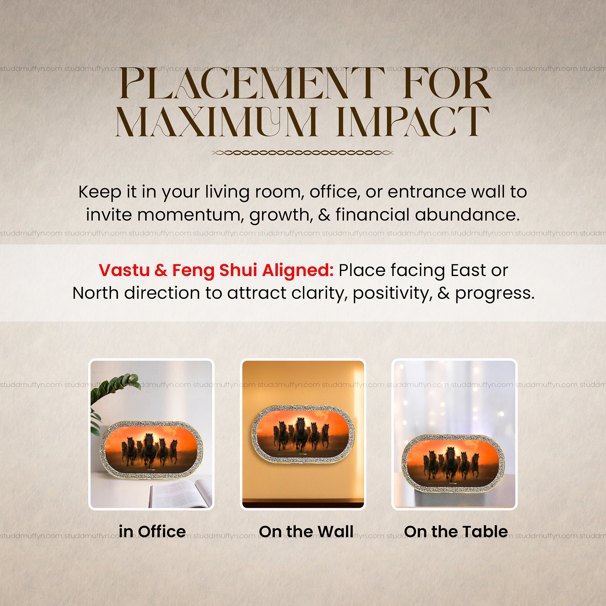 In Vastu, seven horses represent the Sun God’s chariot, bringing speed, growth, and unstoppable momentum. The black form amplifies this energy, signifying determination, courage, and the ability to overcome obstacles. Placed in a home or workplace, this plate channels power to break through barriers and move towards success with unwavering confidence.