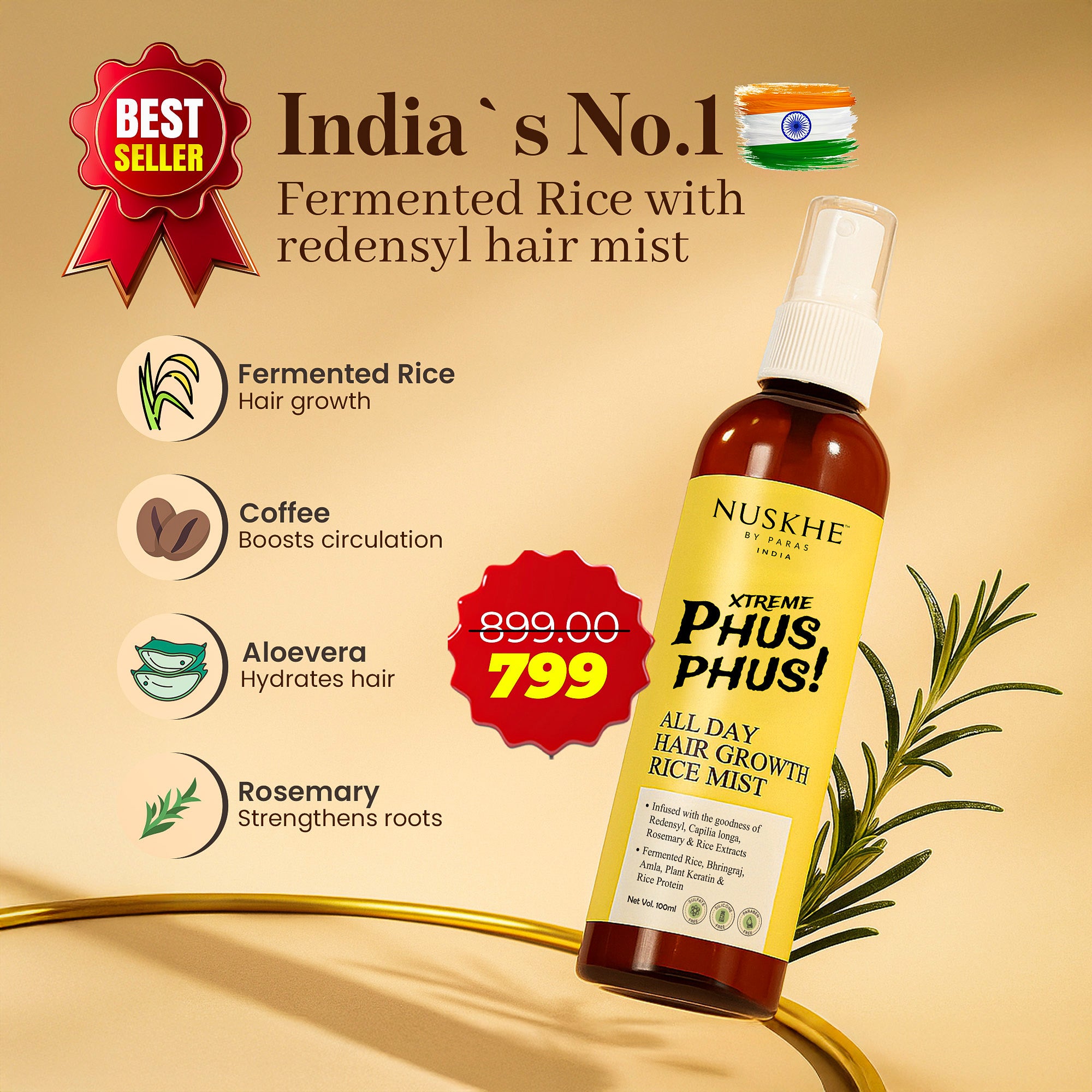 Rice (Oryza sativa) Ext., Aloevera (Aloe barbadensis) leaf Ext., Fenugreek (Trigonella foenum-graecum) Ext., Bhringraj(Eclipta alba) Ext., Neem(Azardirachta indica) Ext., Rosemary ( Rosmarinus officinalis) Ext., Coffee (Coffea Arabica) Ext., Pumpkin (Cucurbita pepo) Ext., Larix Europaea Wood Extract, Camellia Sinensis Leaf Extract, Capilia longa(Curcuma longa) Ext. Rice (Oryza sativa) Protein, Plant Keratin Protein
