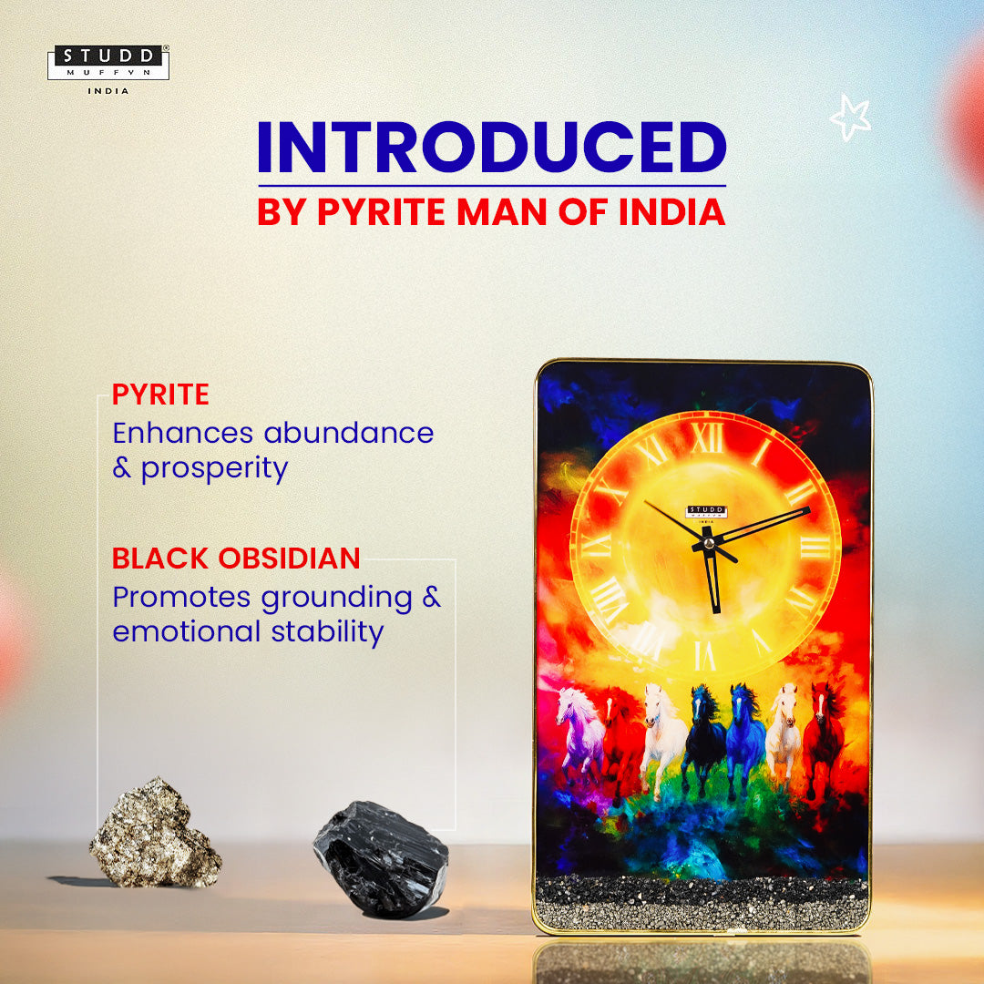 Experience the timeless symbolism of progress and victory with the 7 Horses Richie Rich Clock, crafted with authentic Pyrite and Obsidian crystals.