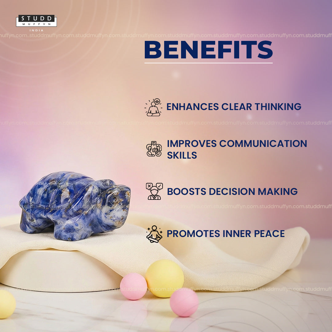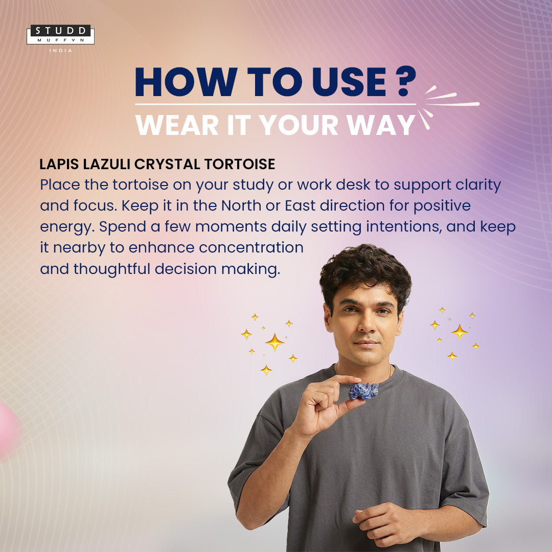The combination of tortoise symbolism and Lapis Lazuli crystal forms an energy that supports clarity in thoughts, confident communication, and balanced decision making.