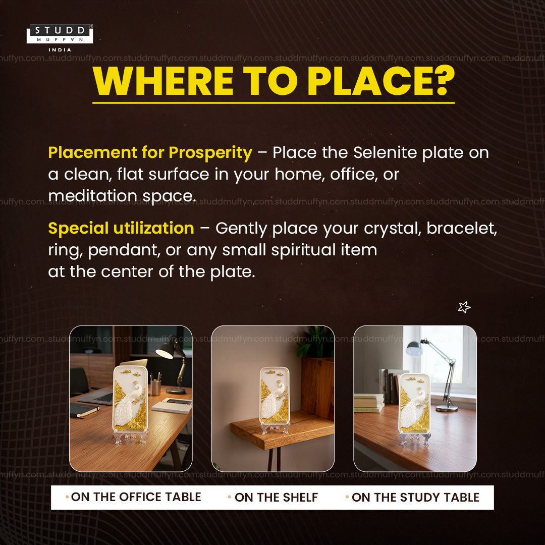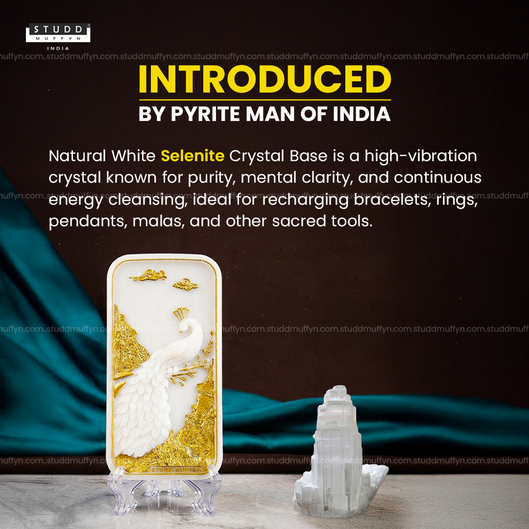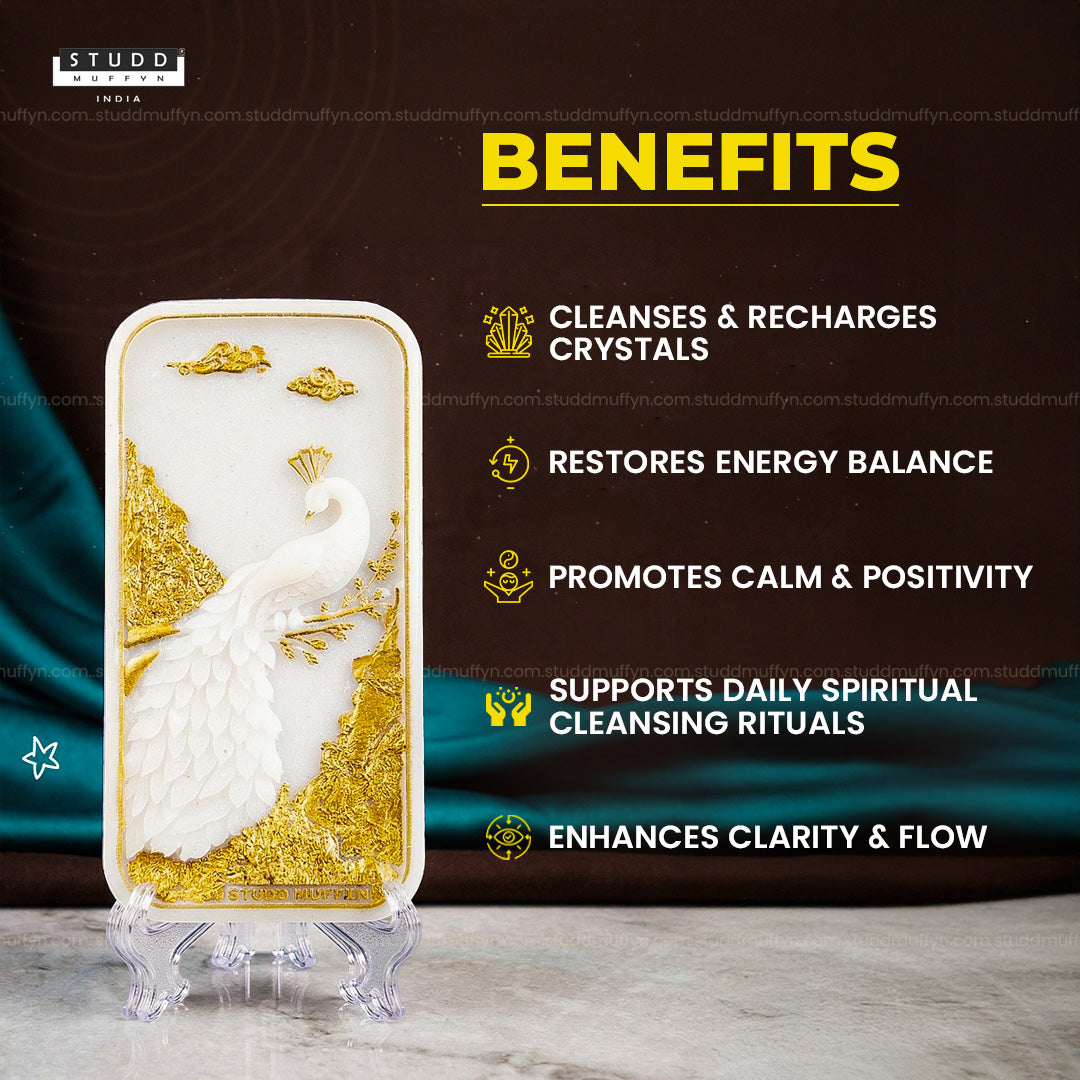 This Peacock Aura Shuddhi Selenite Plate is designed to purify, elevate, and harmonize the energy of your space. Crafted from high-vibration selenite, it naturally clears stagnant energies and restores a sense of calm, balance, and spiritual clarity without absorbing negativity.