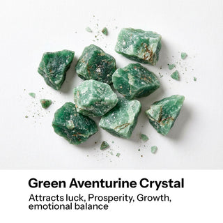 Natural crystal of Rose Quartz and Green Aventurine are placed within the design. Rose Quartz is known for love, emotional healing, and warmth, while Green Aventurine supports growth, positivity, and gentle prosperity. Together, they help create a balanced and happy environment.