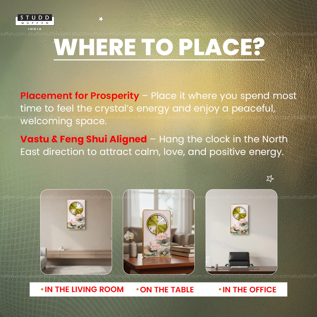 From the house of Studd Muffyn Crystal Homes, bring calm, love, and gentle abundance into your space with the Rose Quartz–Aventurine Lotus Clock. This wall clock beautifully blends peaceful artwork with soothing crystal energy, making it perfect for homes that love calm and elegance.