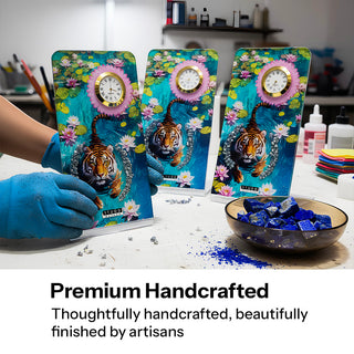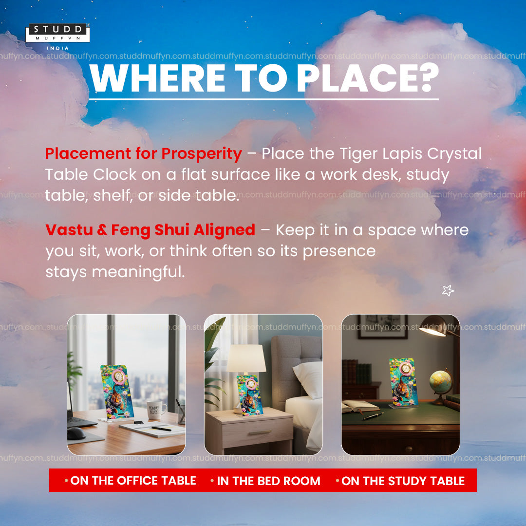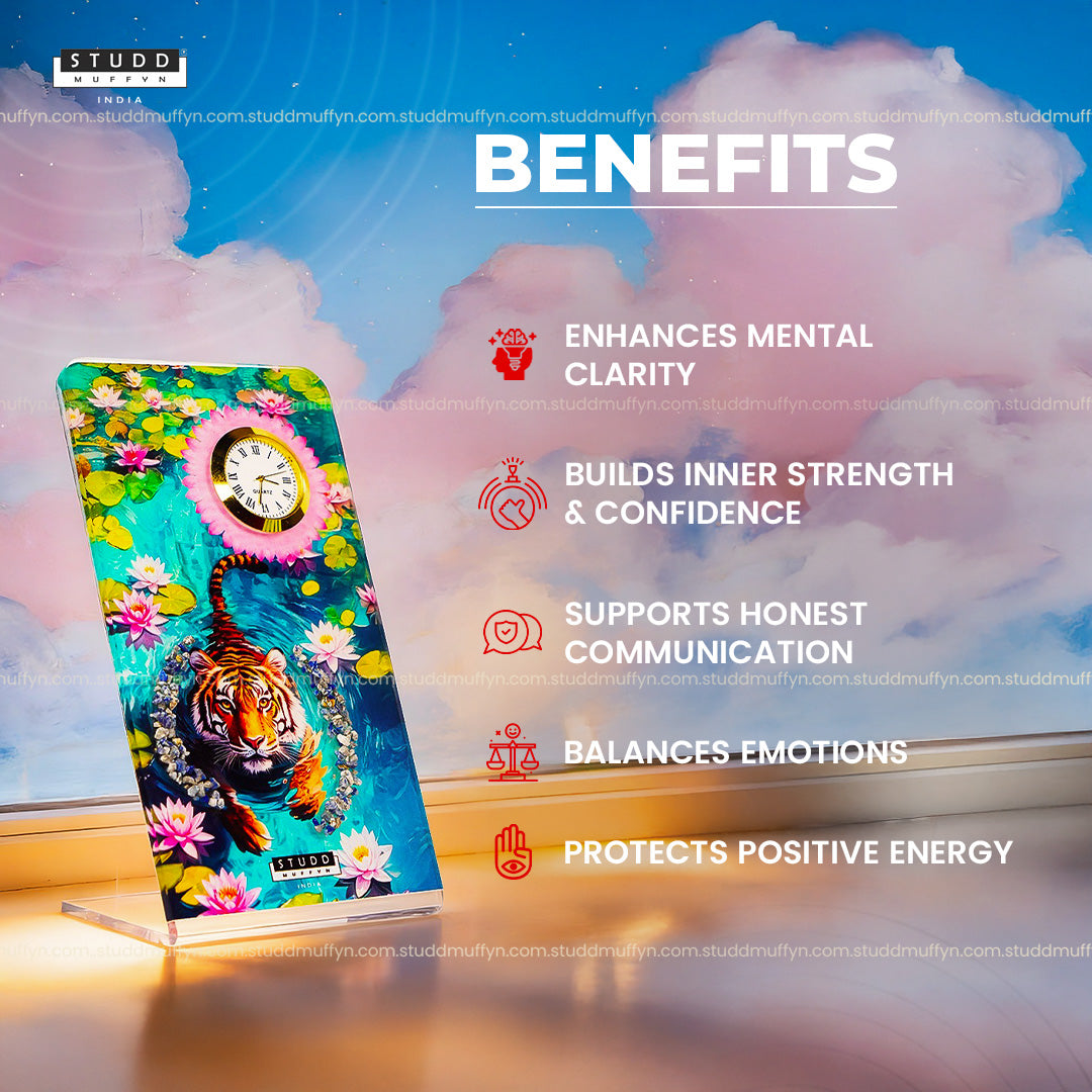 Thoughtfully created by India's biggest home decor and Energy brand the Tiger Lapis Crystal Table Clock is a bold tabletop decor piece designed for spaces that lead with clarity, confidence, and inner strength.