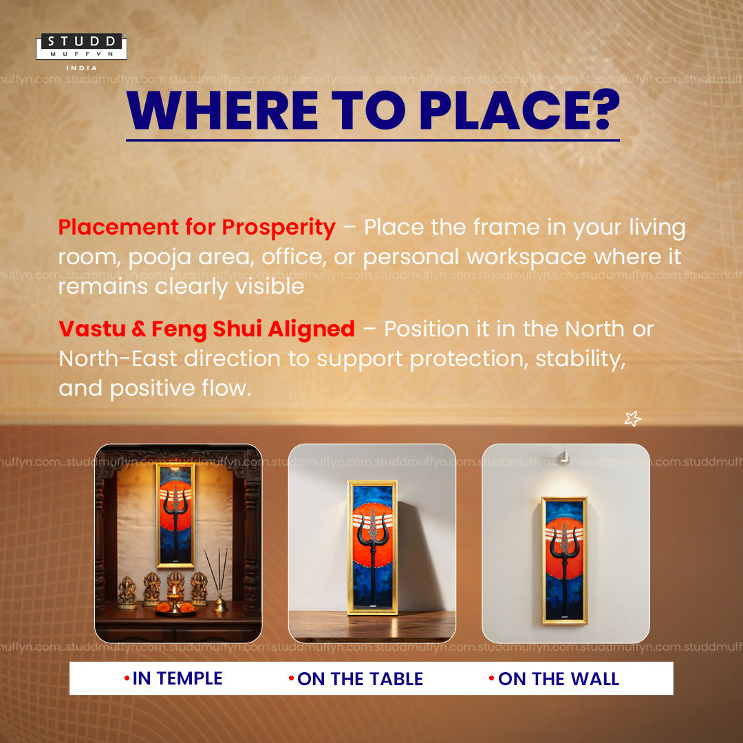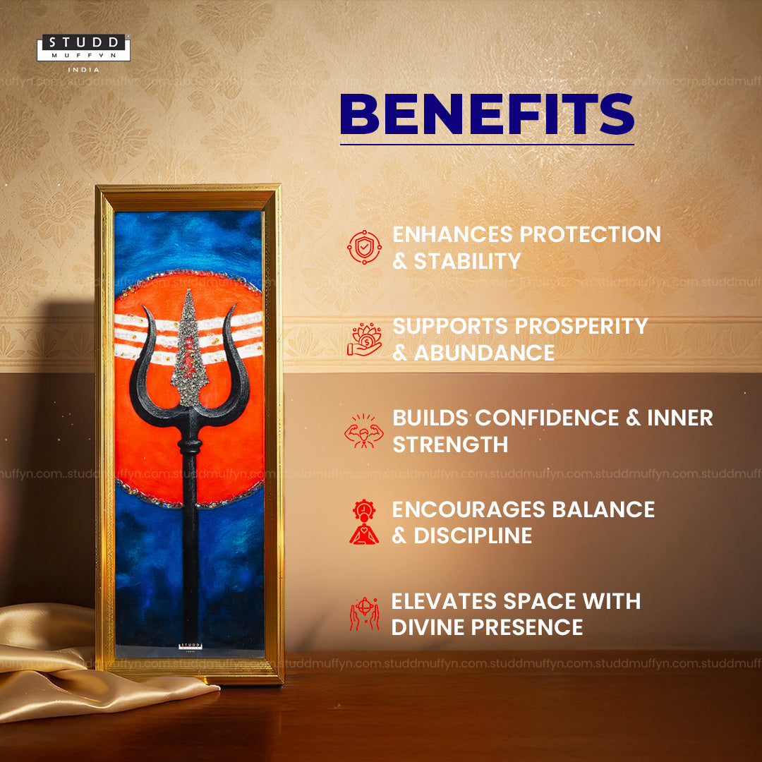 Hey there! India's biggest home decor brand presents the powerful Trishul Pyrite Sleek Golden Frame, a spiritual décor piece designed to bring protection, strength, and abundance into your space. Inspired by Lord Shiva’s sacred Trishul, this elegant frame symbolises divine strength, spiritual power, and protection rooted in ancient Indian traditions.
