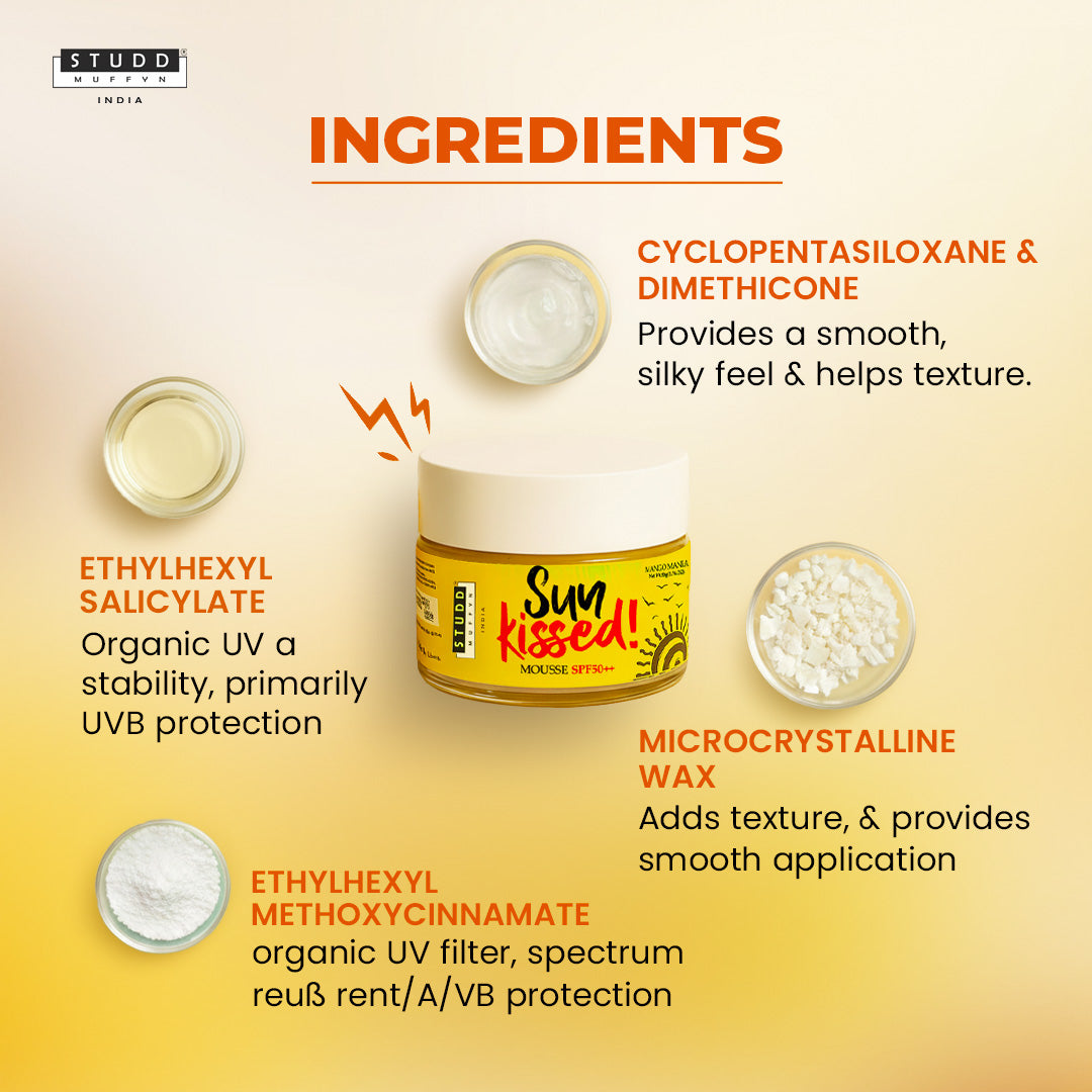 Introducing Studd Muffyn Sun Kissed Mousse SPF50++ | Mango Mania, a multitasking skin-protecting marvel that shields your skin from UV rays while supporting a youthful, even-toned glow. Its featherlight mousse texture glides effortlessly, giving you a smooth, airbrushed finish with zero white cast.