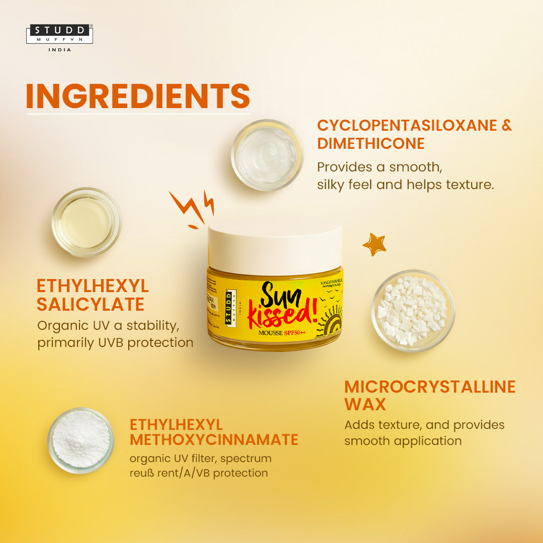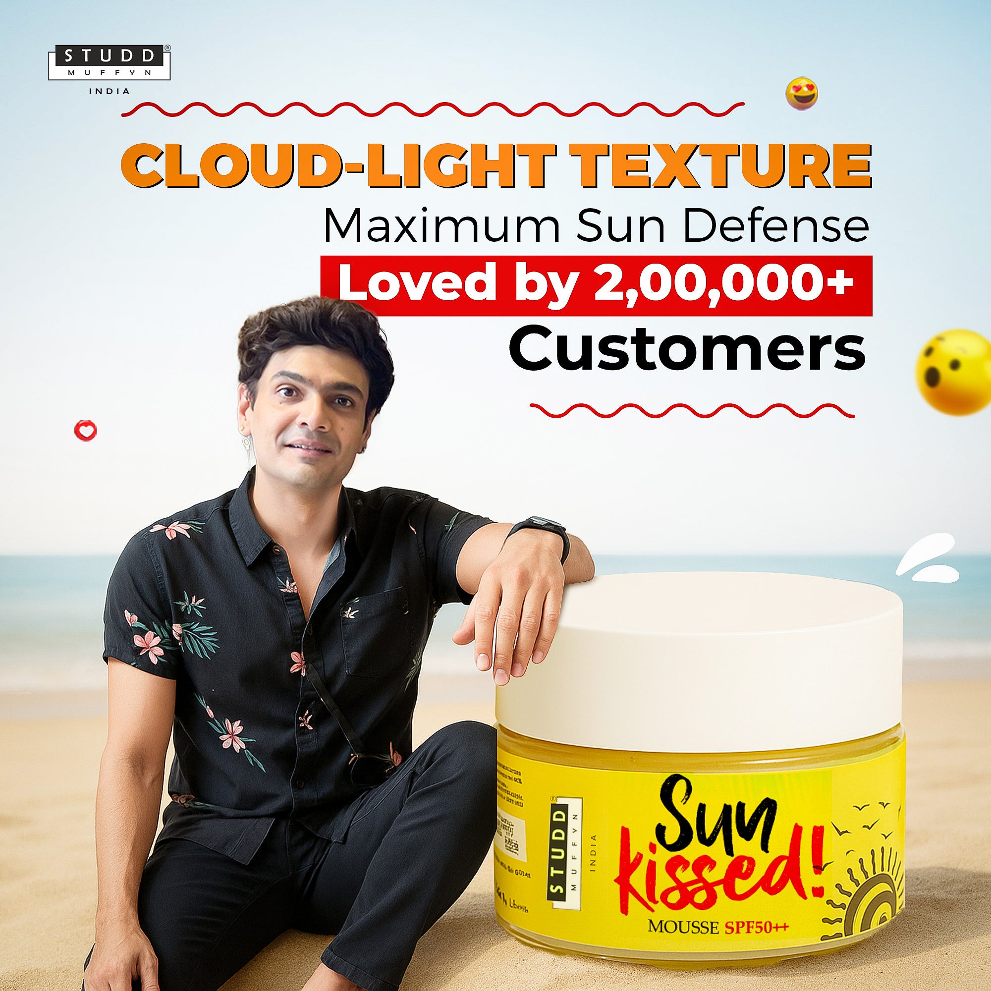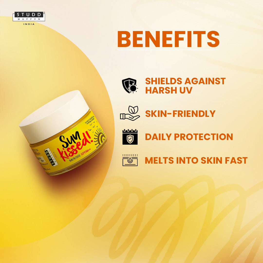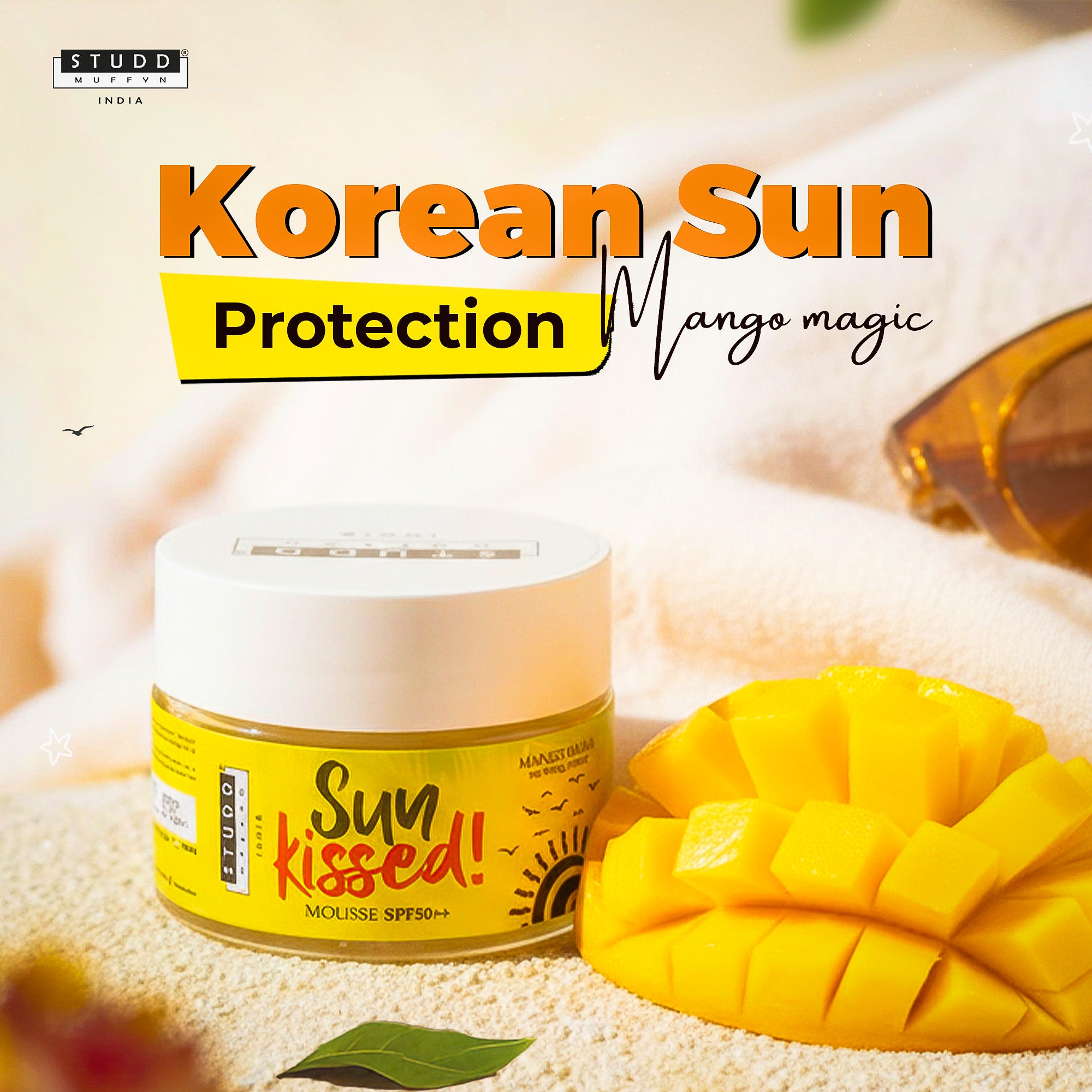 Introducing Studd Muffyn Sun Kissed Mousse SPF50++ | Mango Mania, a multitasking skin-protecting marvel that shields your skin from UV rays while supporting a youthful, even-toned glow. Its featherlight mousse texture glides effortlessly, giving you a smooth, airbrushed finish with zero white cast.