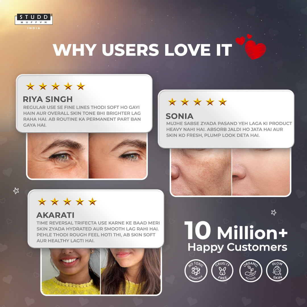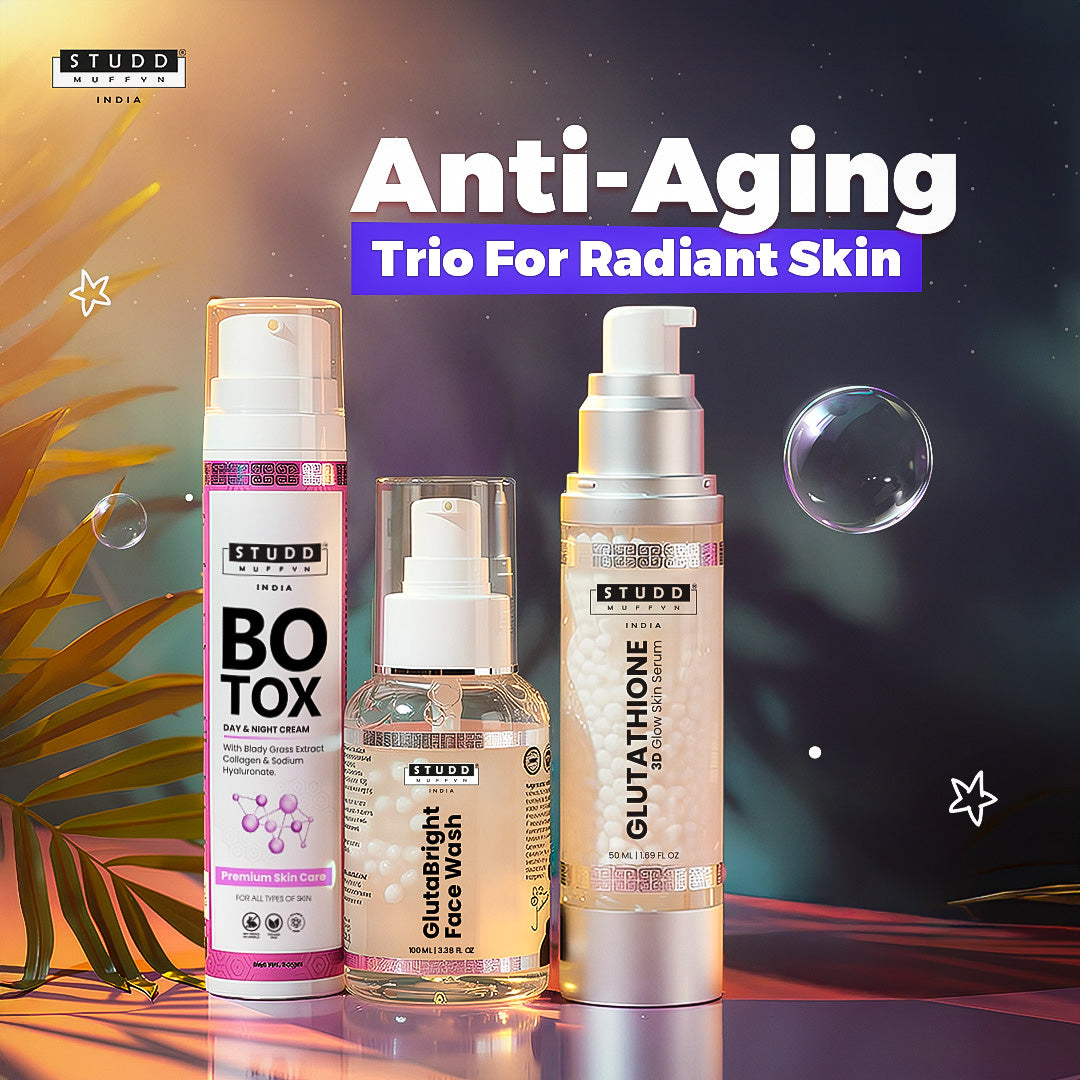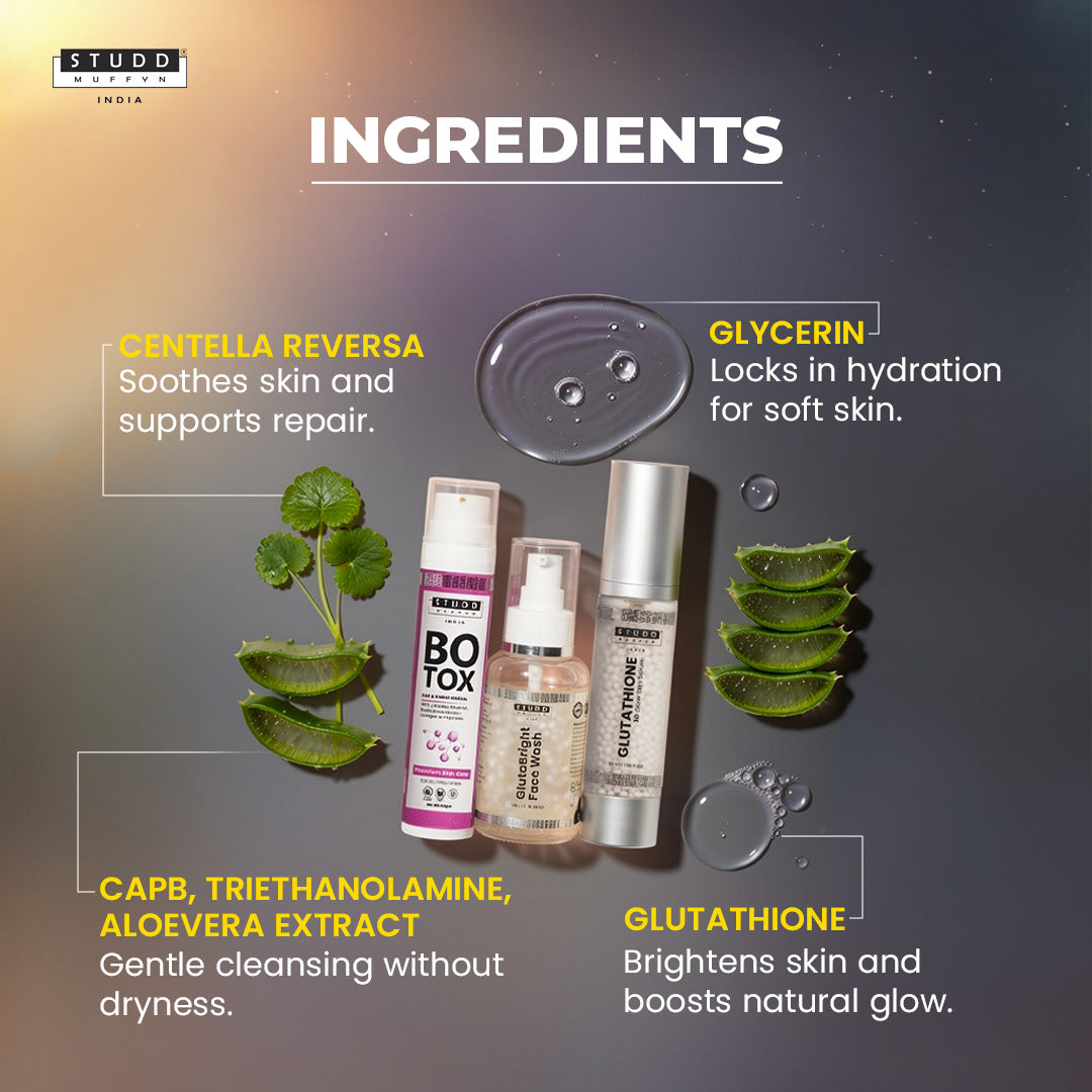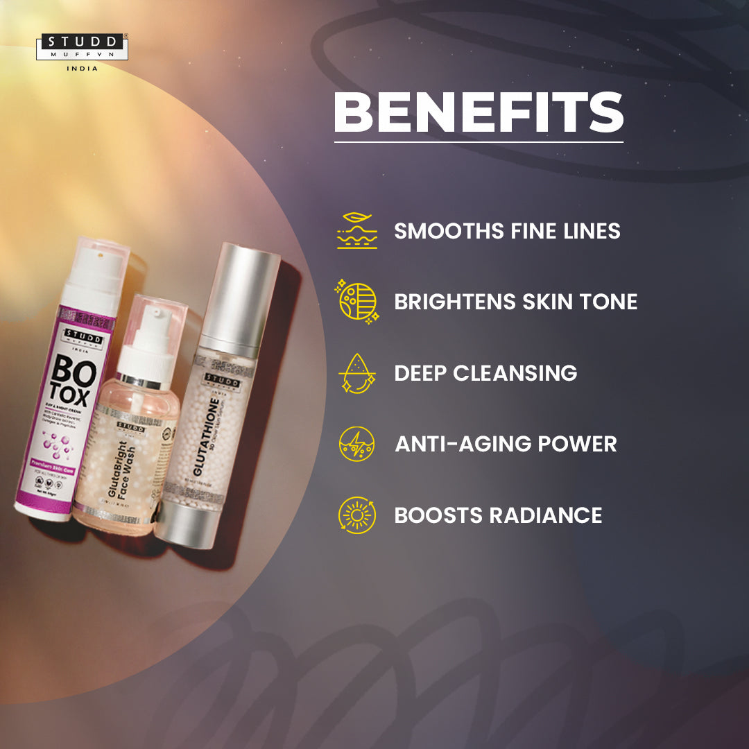 Ready to rewind the clock? Meet the Time Reversal Trifecta—your ultimate anti-aging dream team from Studd Muffyn! 💥 This power-packed combo of Botox, Glutathione 3D Serum, and GlutaBright Face Wash is here to smooth, brighten, and glow your way to younger-looking skin.