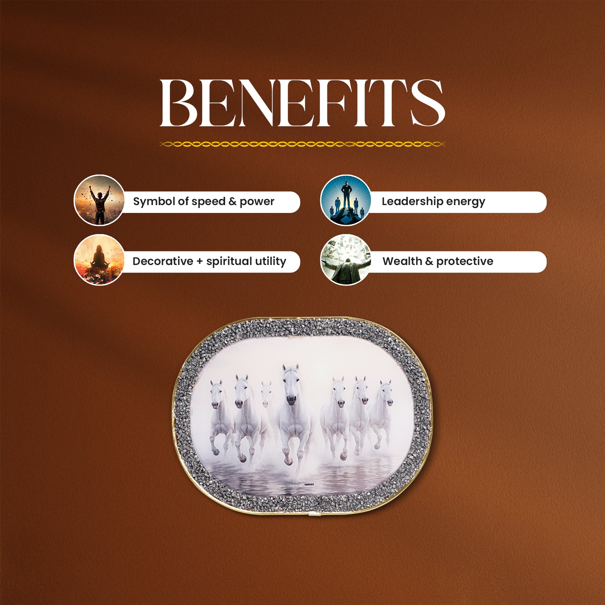 Bring home the divine force of Seven Horses, a universal symbol of speed, power, and success. In Vastu and Feng Shui, the imagery of seven galloping white horses is believed to channel the energy of the Sun God, symbolizing unstoppable momentum, strength, and prosperity.
