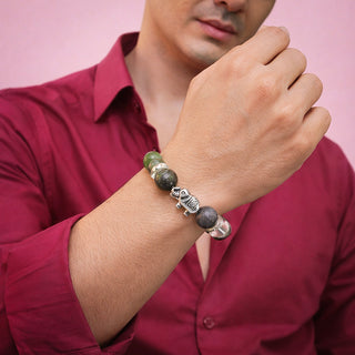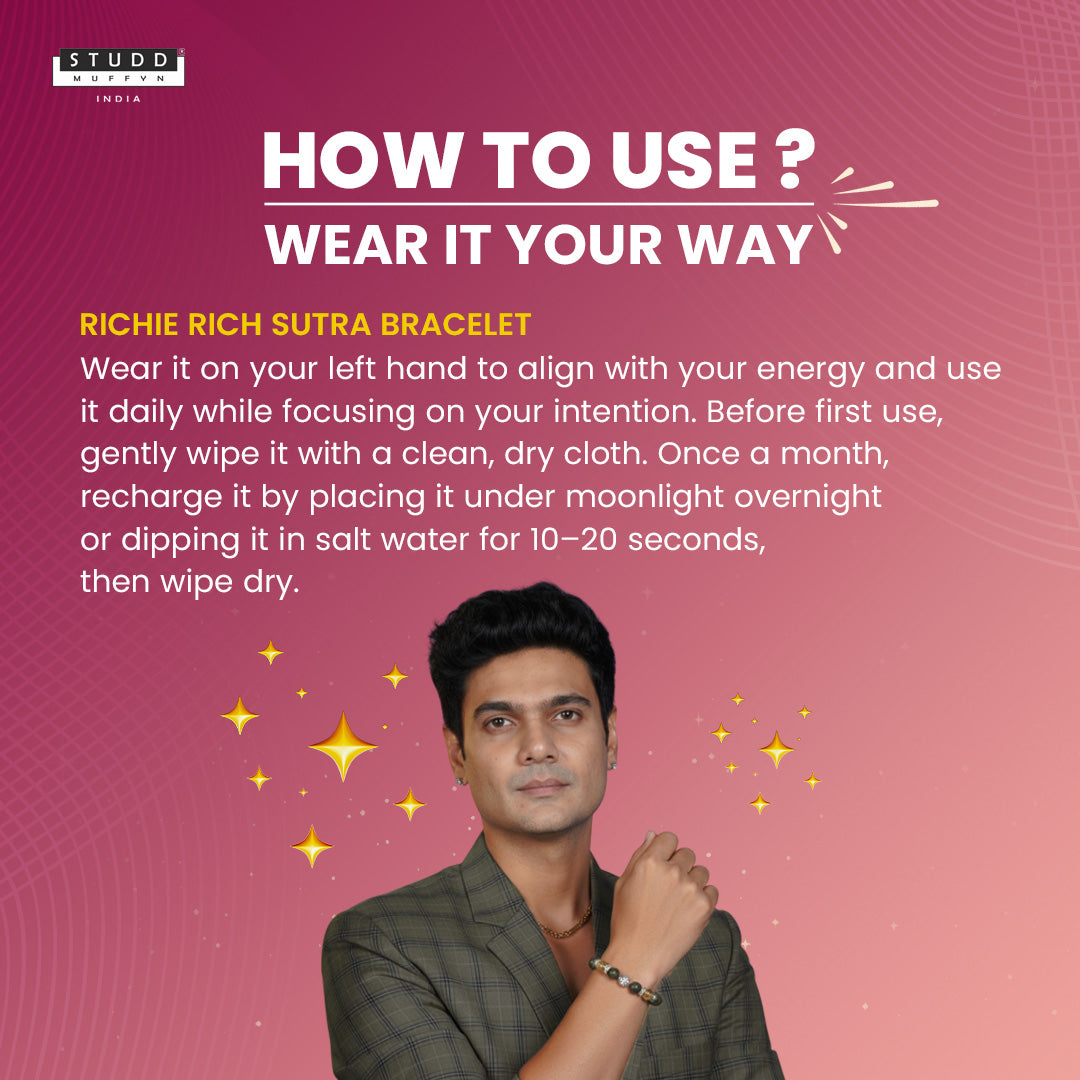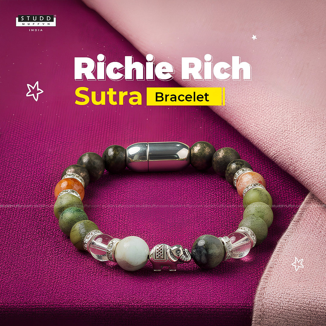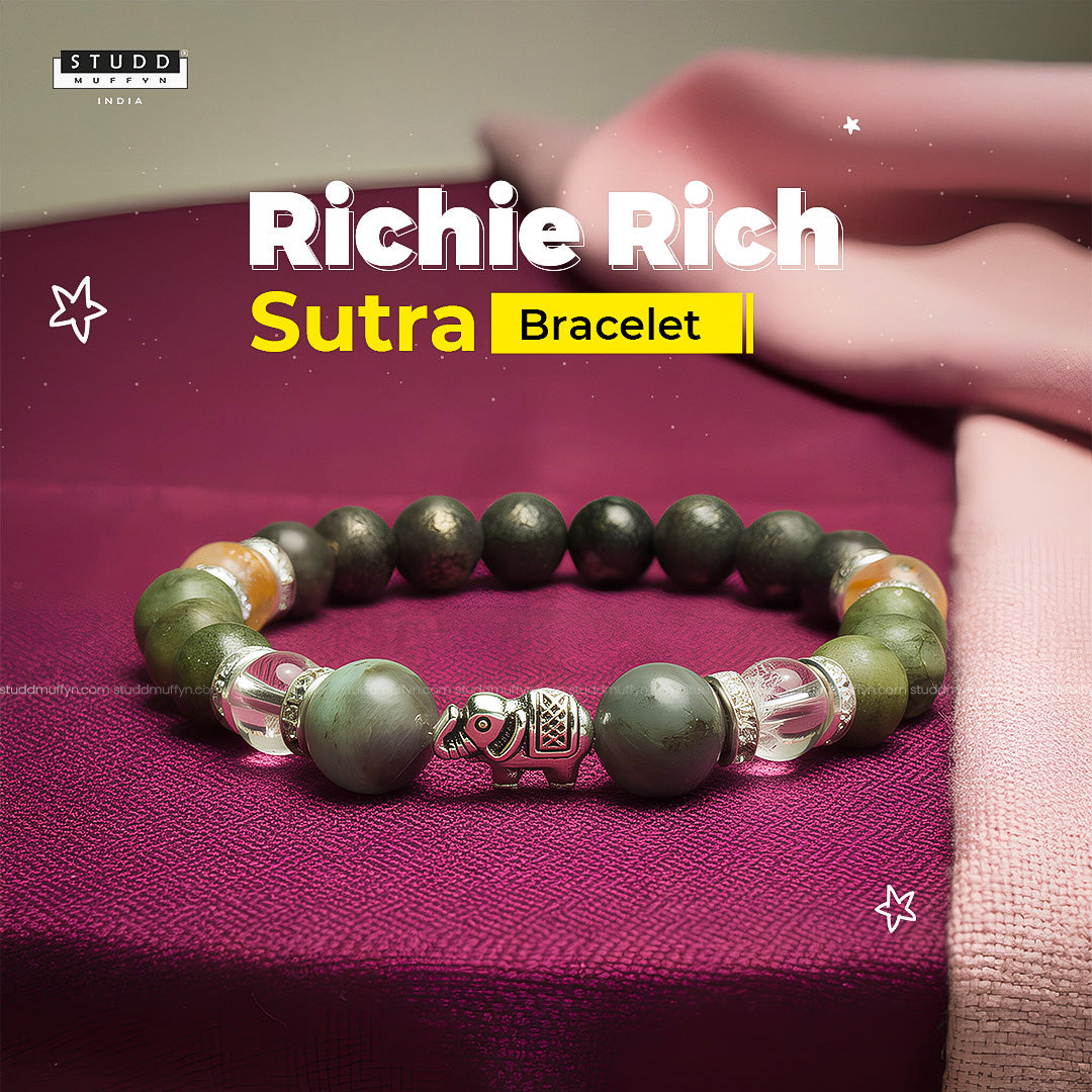 Studd Muffyn presents the Richie Rich Sutra Bracelet, designed with a symbolic elephant charm at the center and surrounded by a powerful combination of Emerald, Clear Quartz, Green Jade, Citrine, and Pyrite to support abundance, stability, and success.
