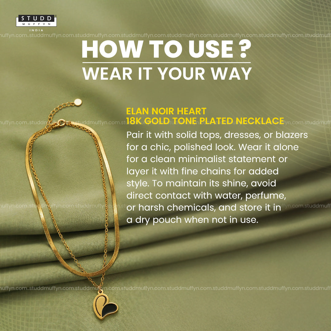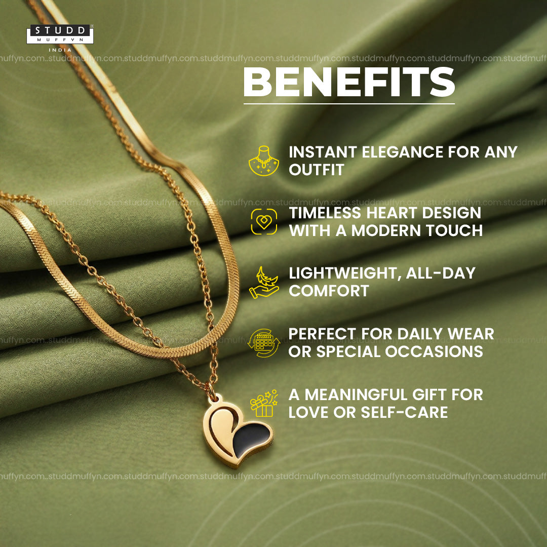 A modern expression of love, elegance, and confidence — the Élan Noir Heart Necklace blends timeless gold with a bold black accent for effortless sophistication. Designed in a graceful layered silhouette, this necklace elevates everyday outfits while making a subtle statement of luxury.