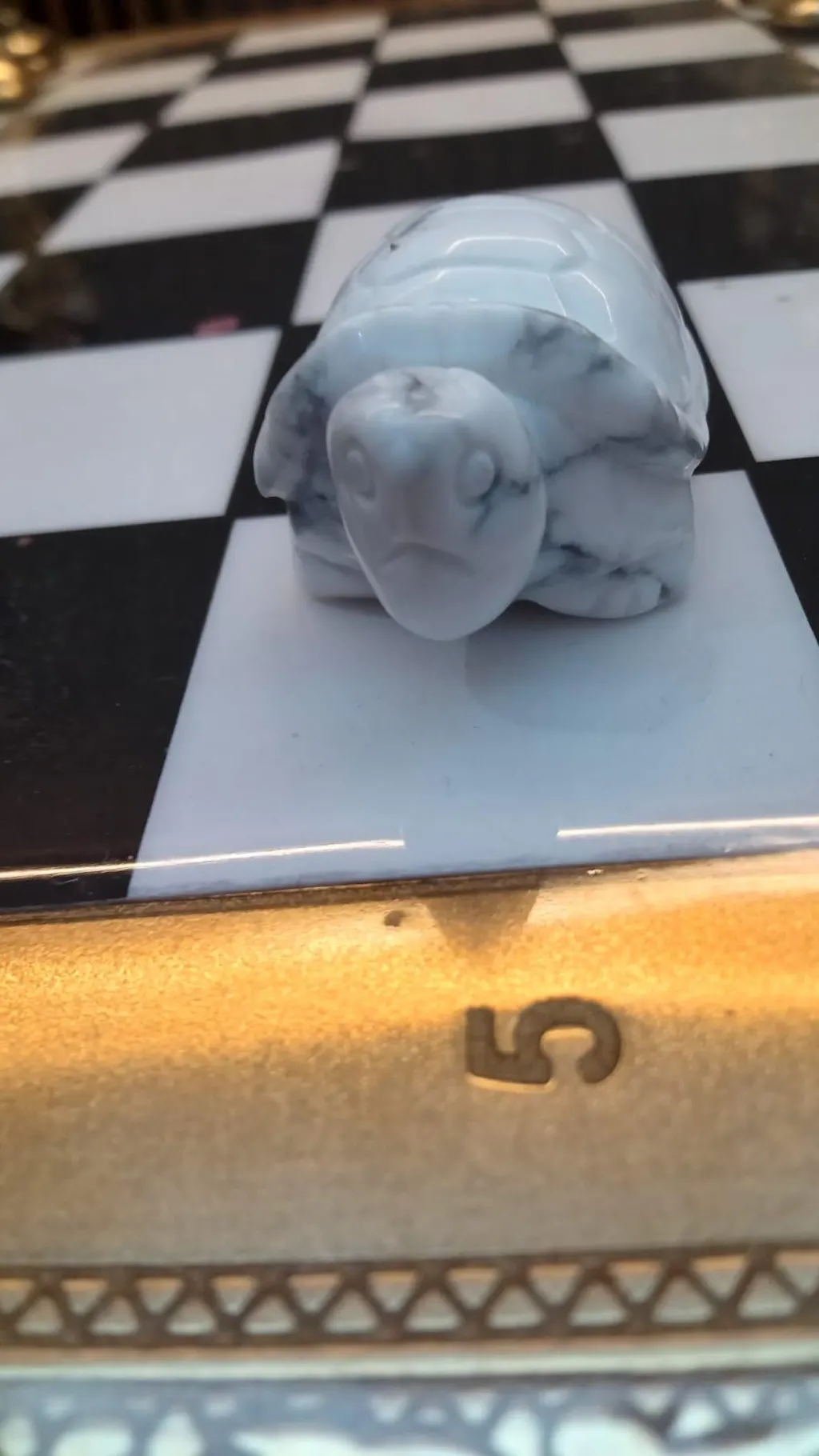 🎨 Design: Hand-carved tortoise with natural white and grey patterned finish