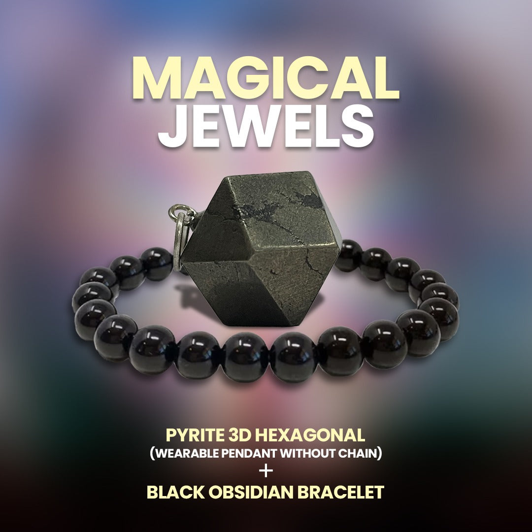 Magical Jewels ( Pyrite 3D Hexagonal Pendant (without chain) & Black Obsidian Bracelet )