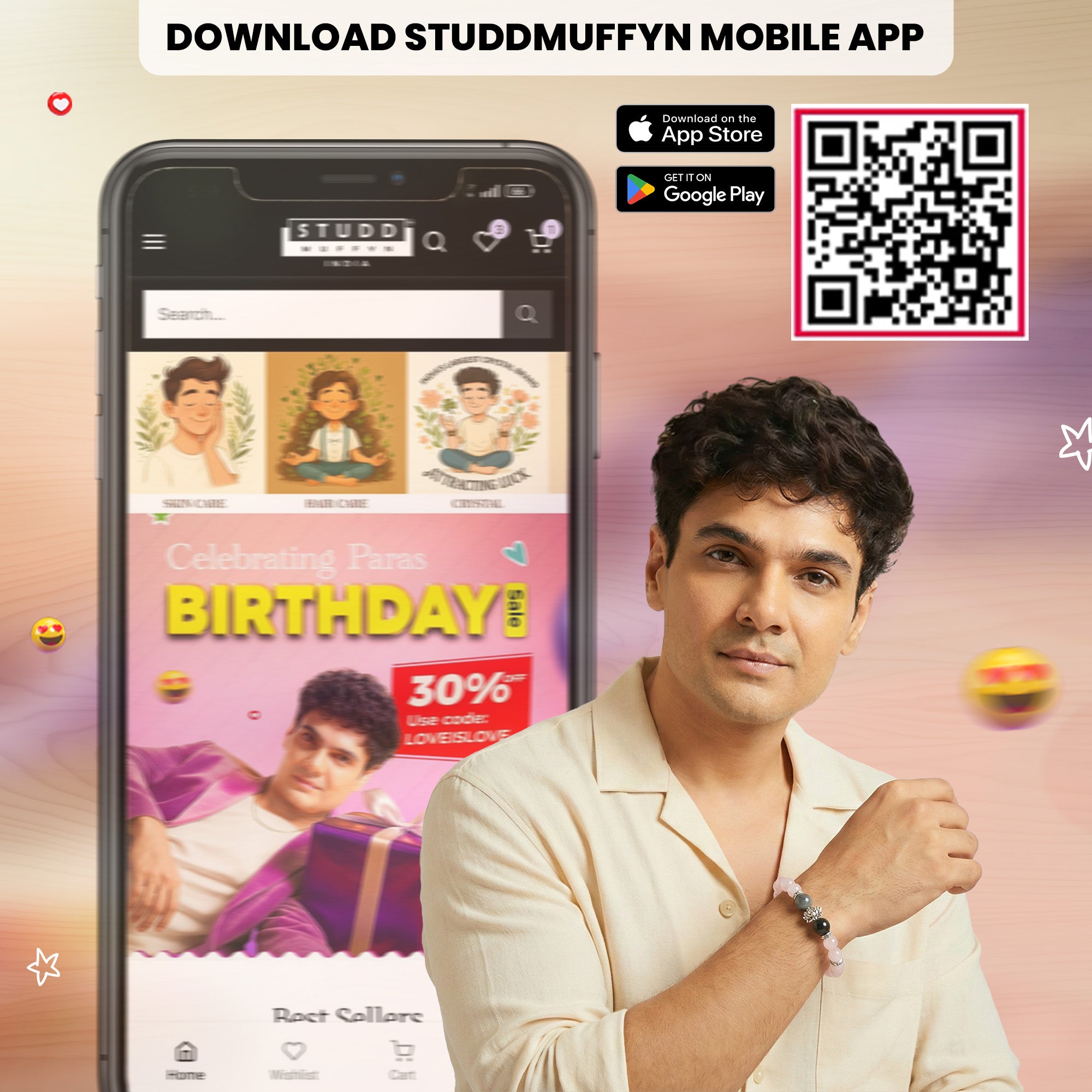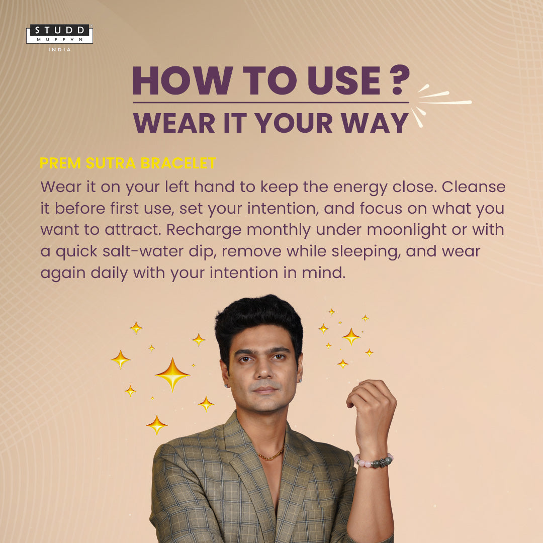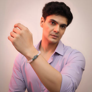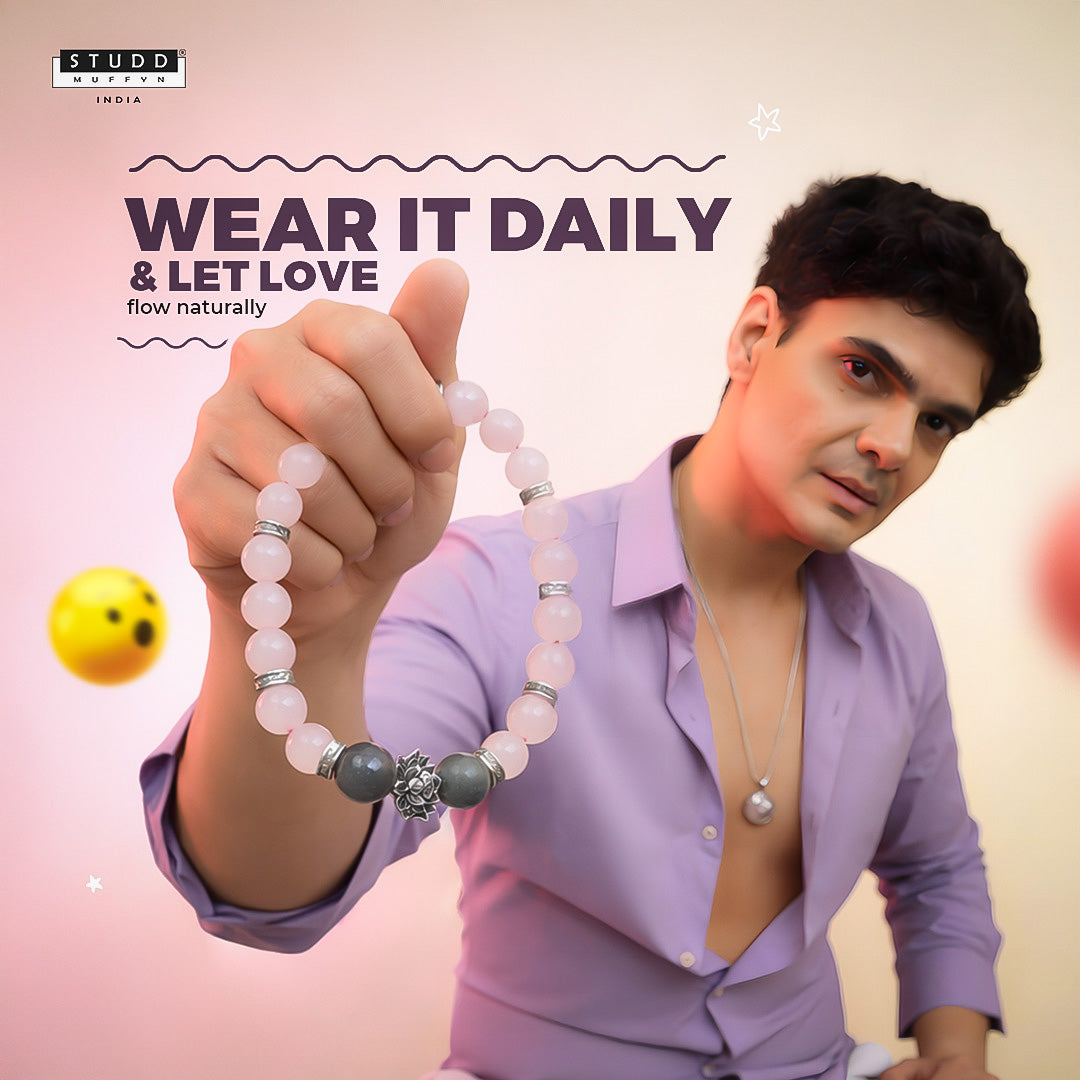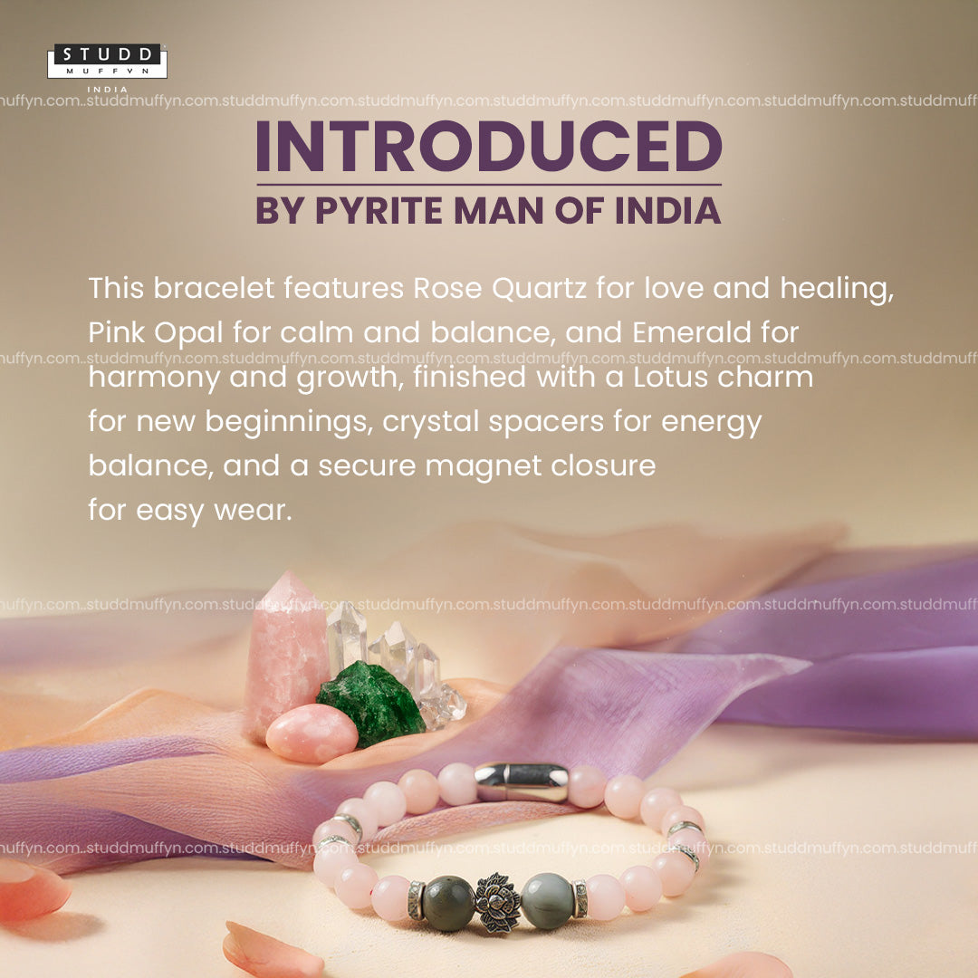 Studd Muffyn presents the Prem Sutra Bracelet, a soulful combination of Rose Quartz, Pink Opal, and Emerald crystals, designed to attract love, emotional comfort, and peaceful relationships.